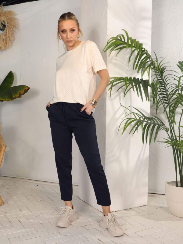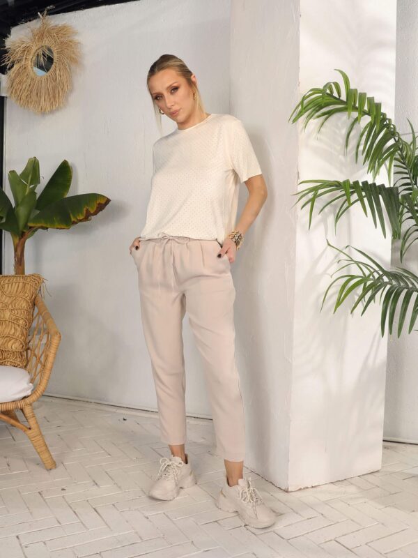 Ekru Yaprak Nakış İşleme Keten Pantolon