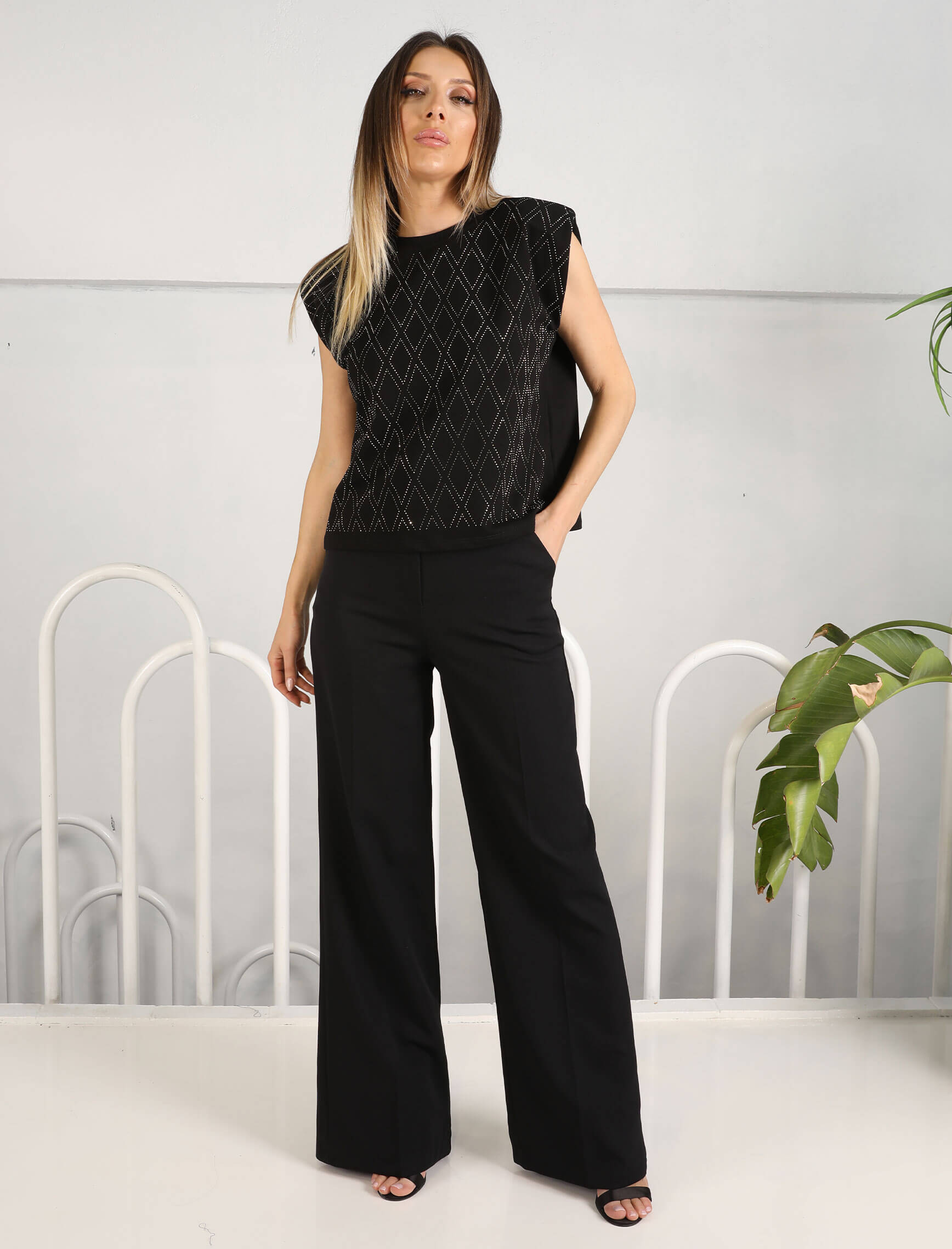 Baklava Taşlı Siyah Bluz