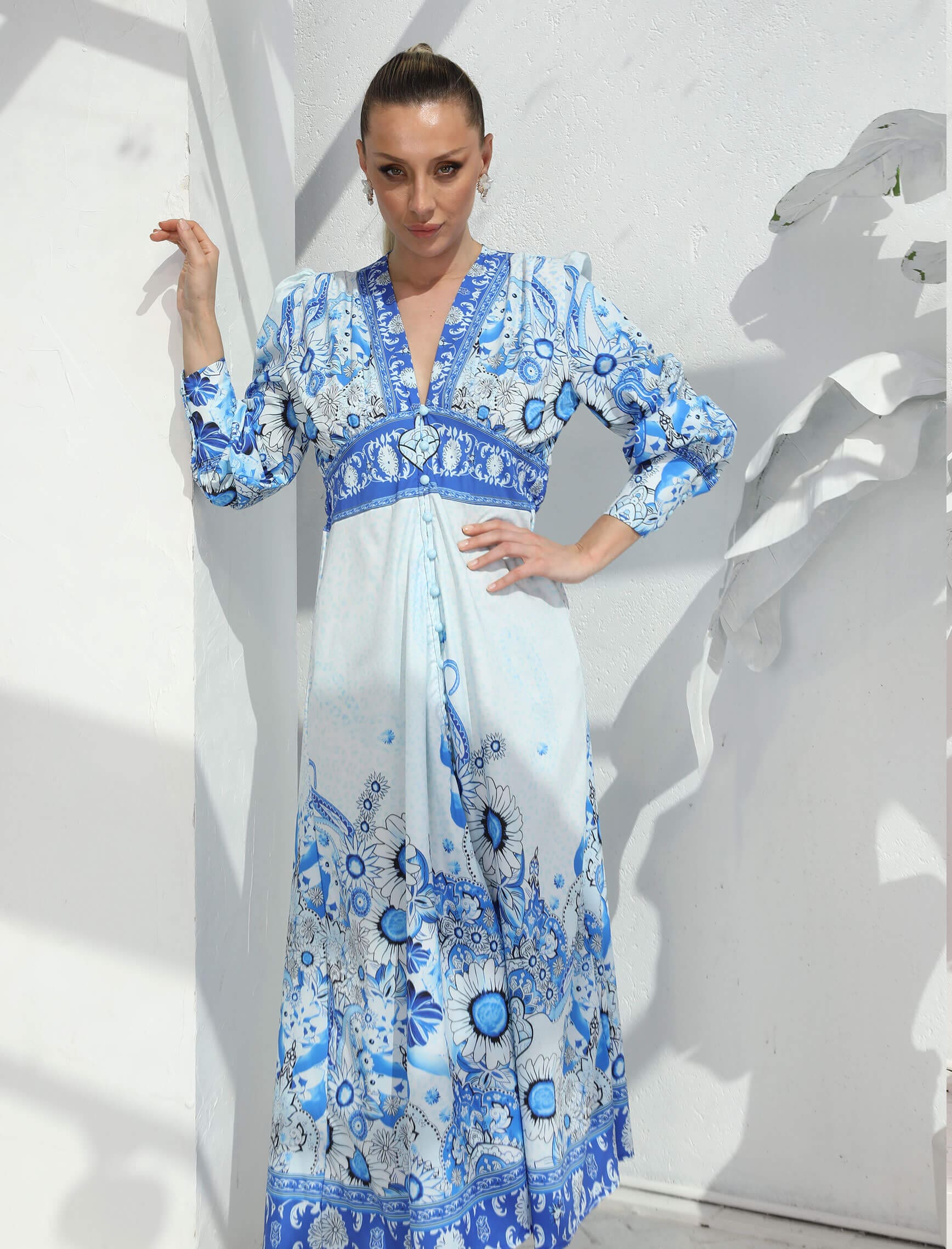 Bebe Mavi Çiçek Desen V Yaka Elbise