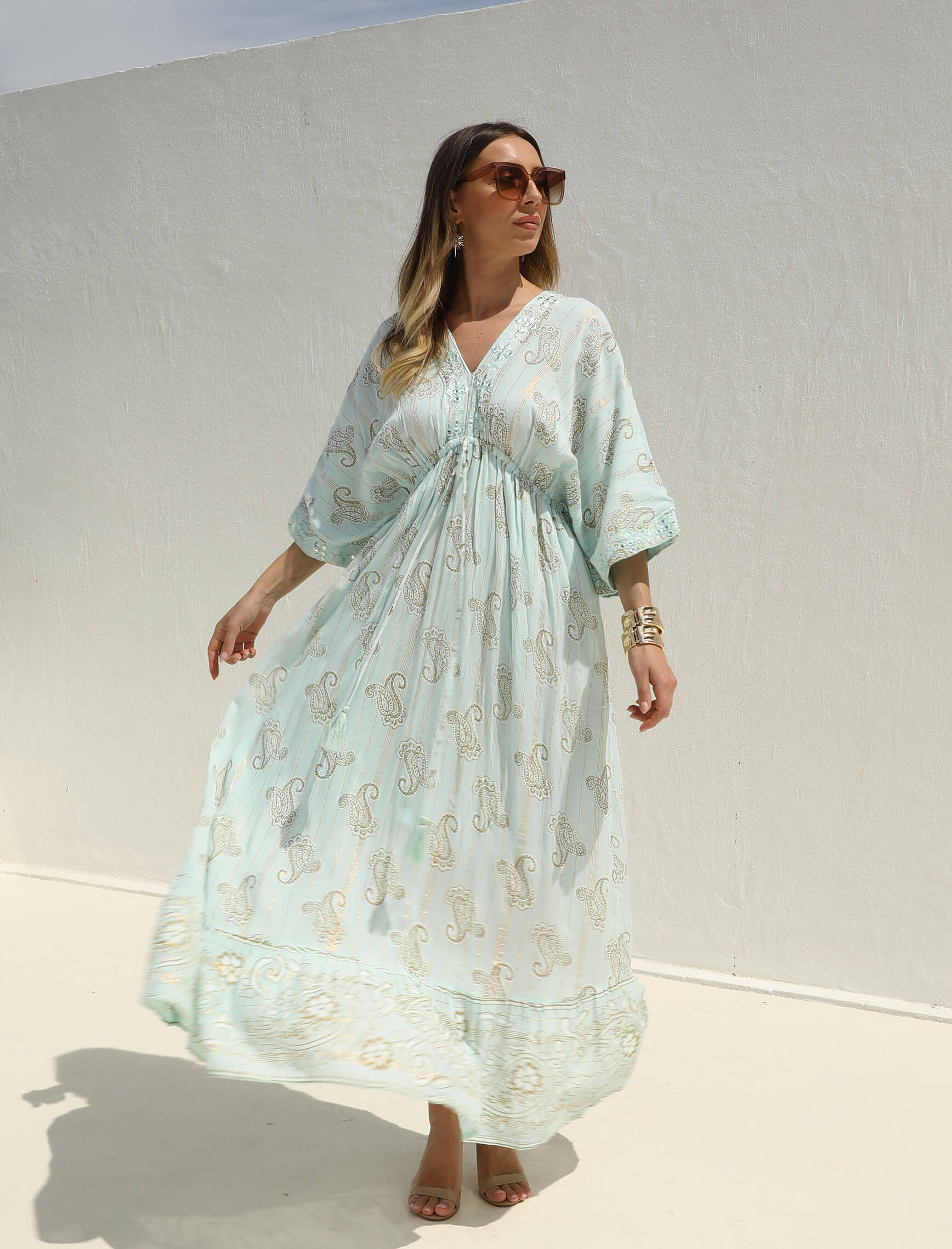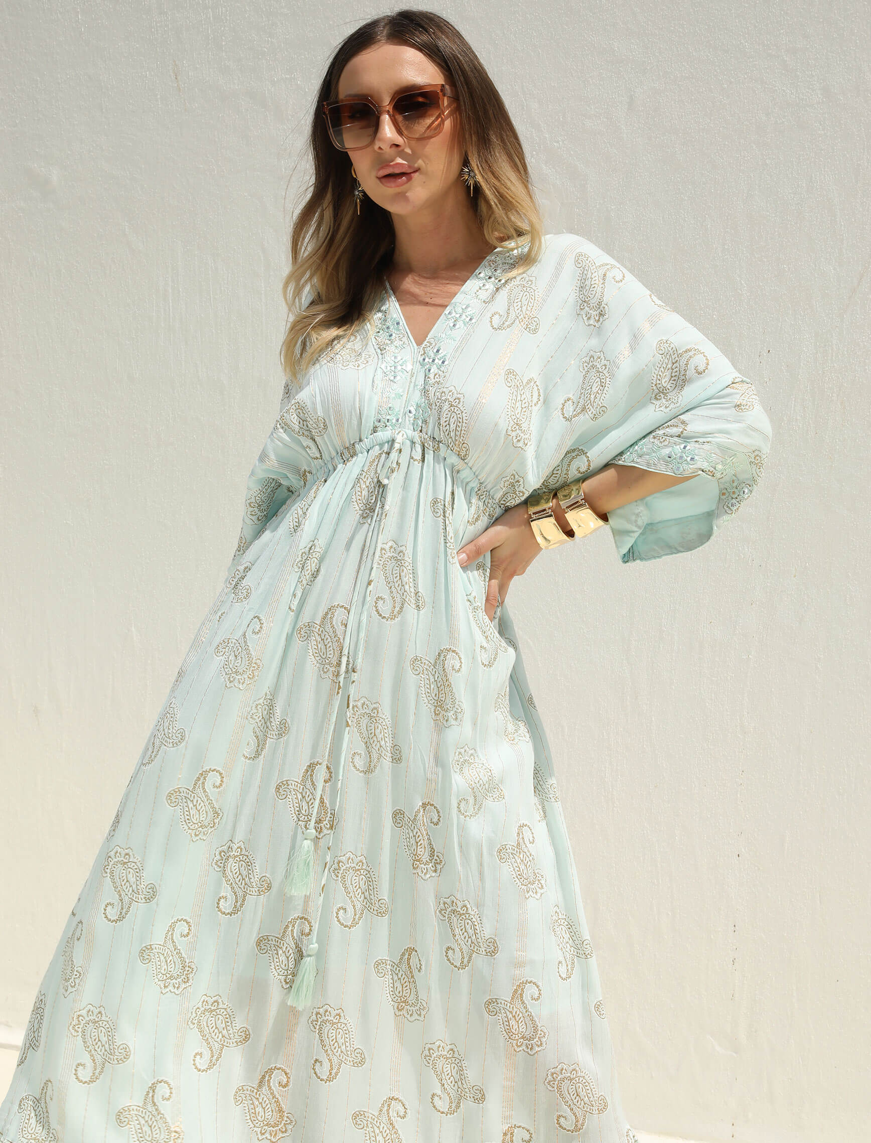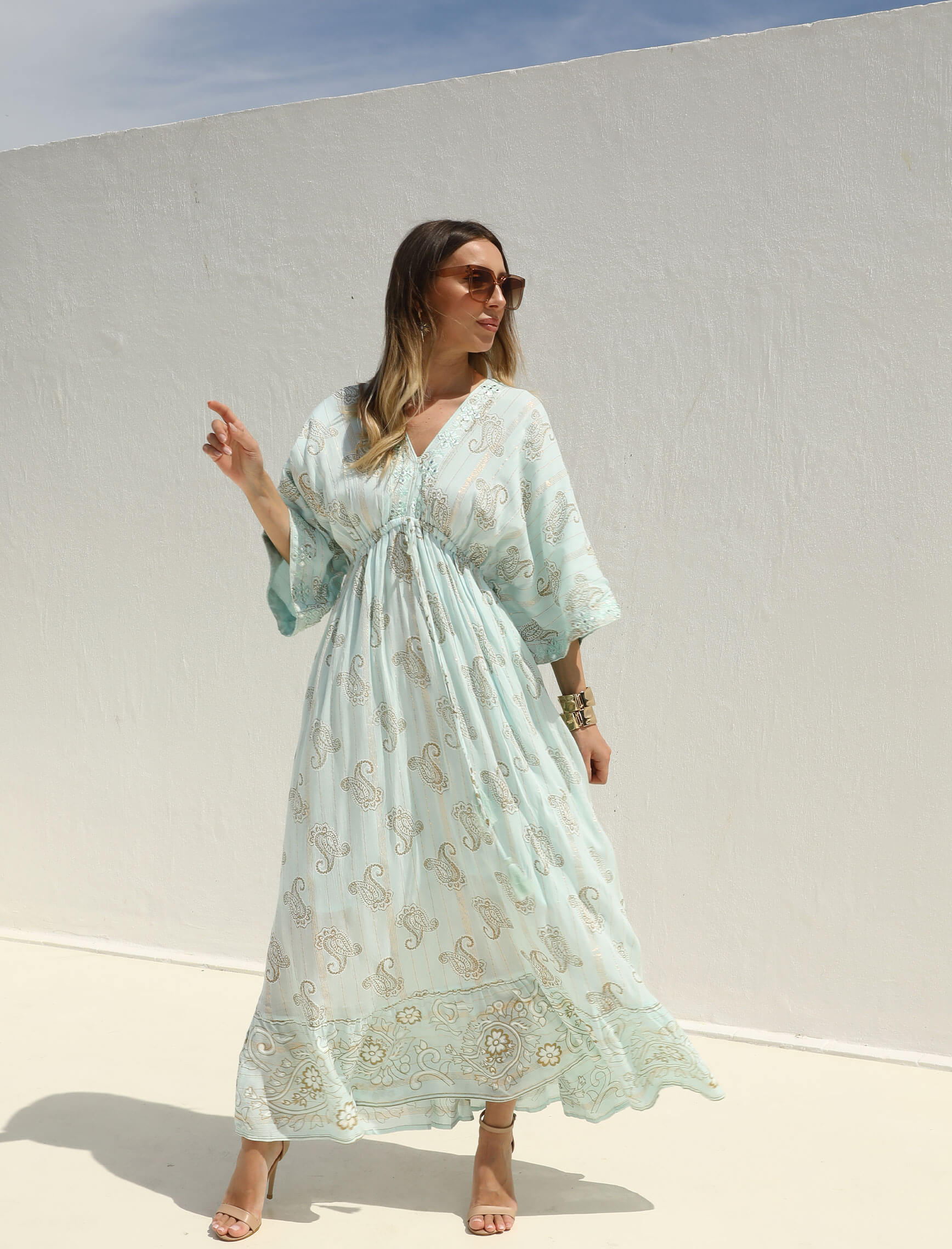 Bebe Mavi Şal Desen Soria Keten Elbise