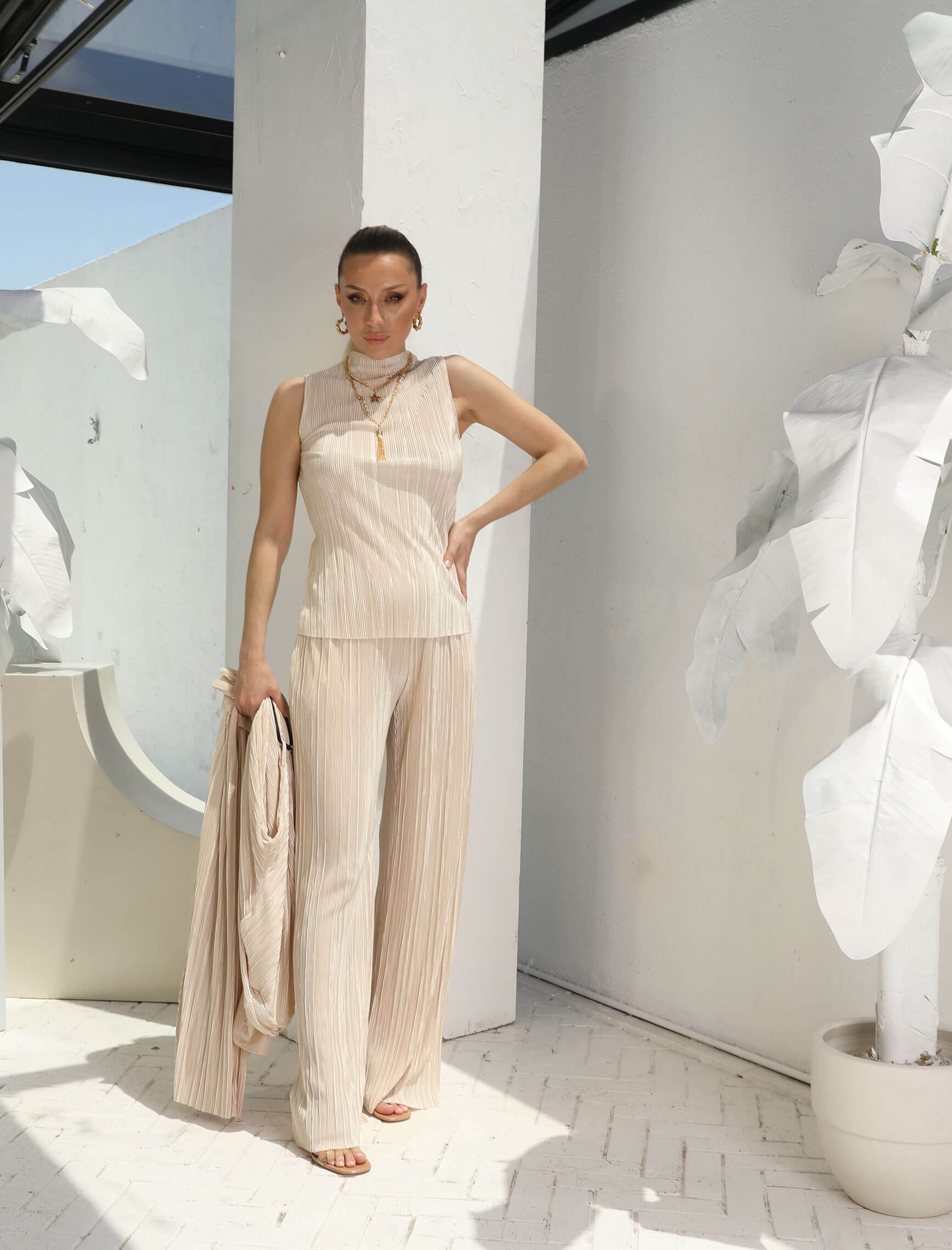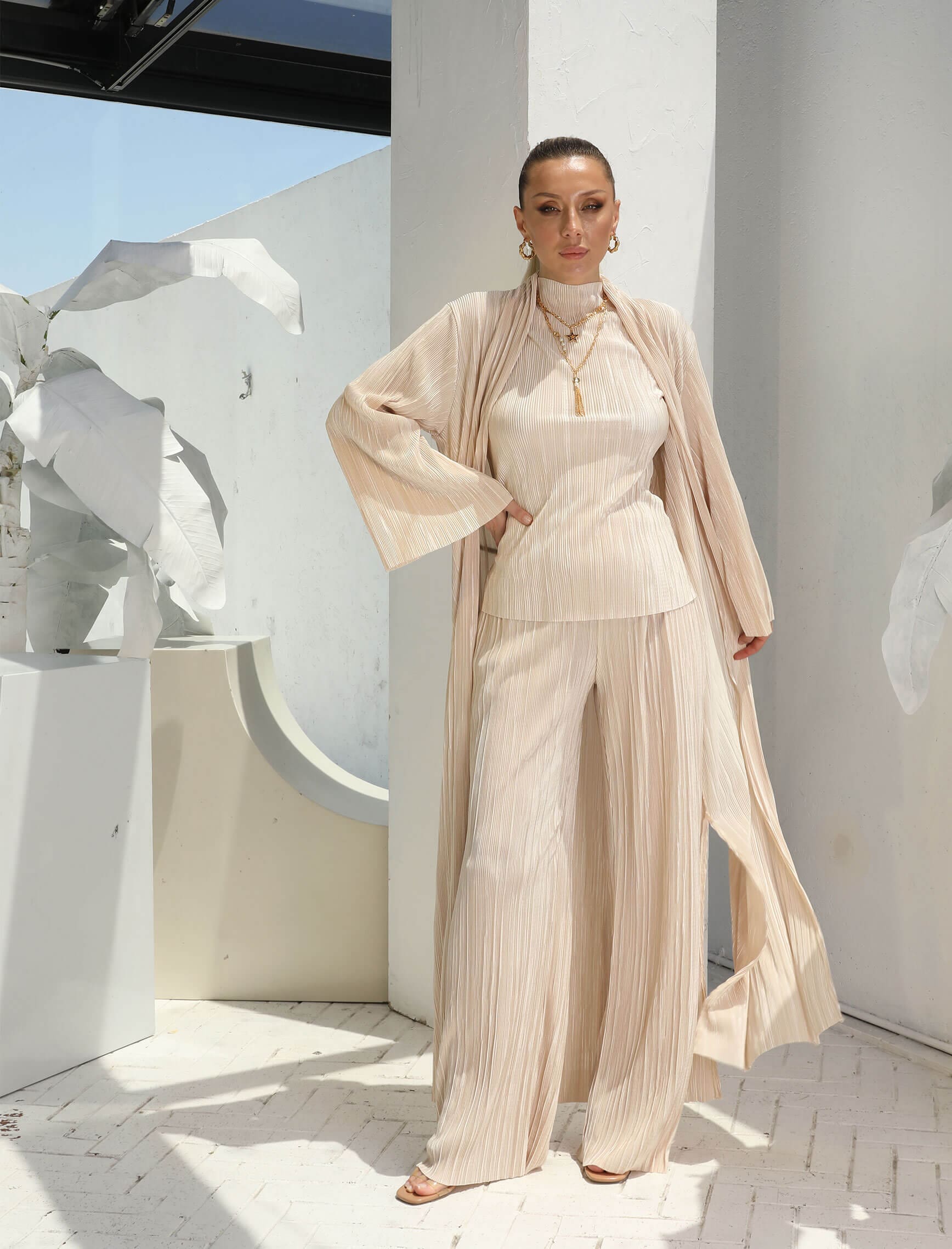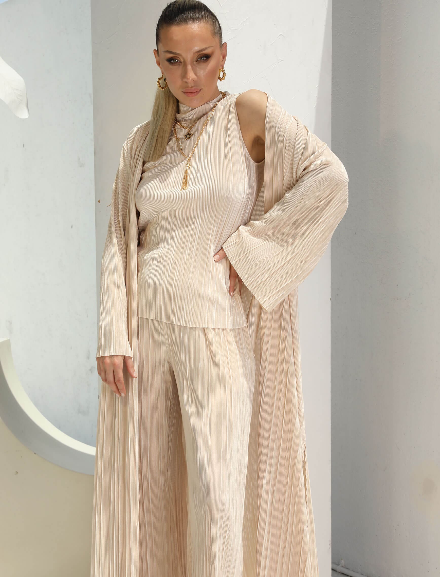 Bej Bluz Pantolon Kimono Takım