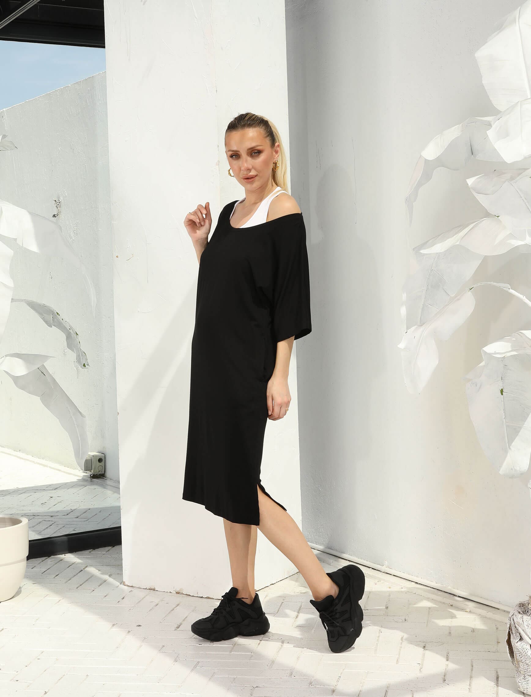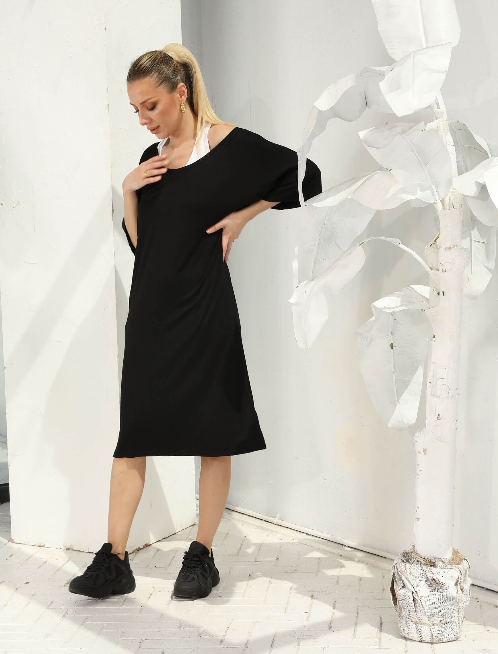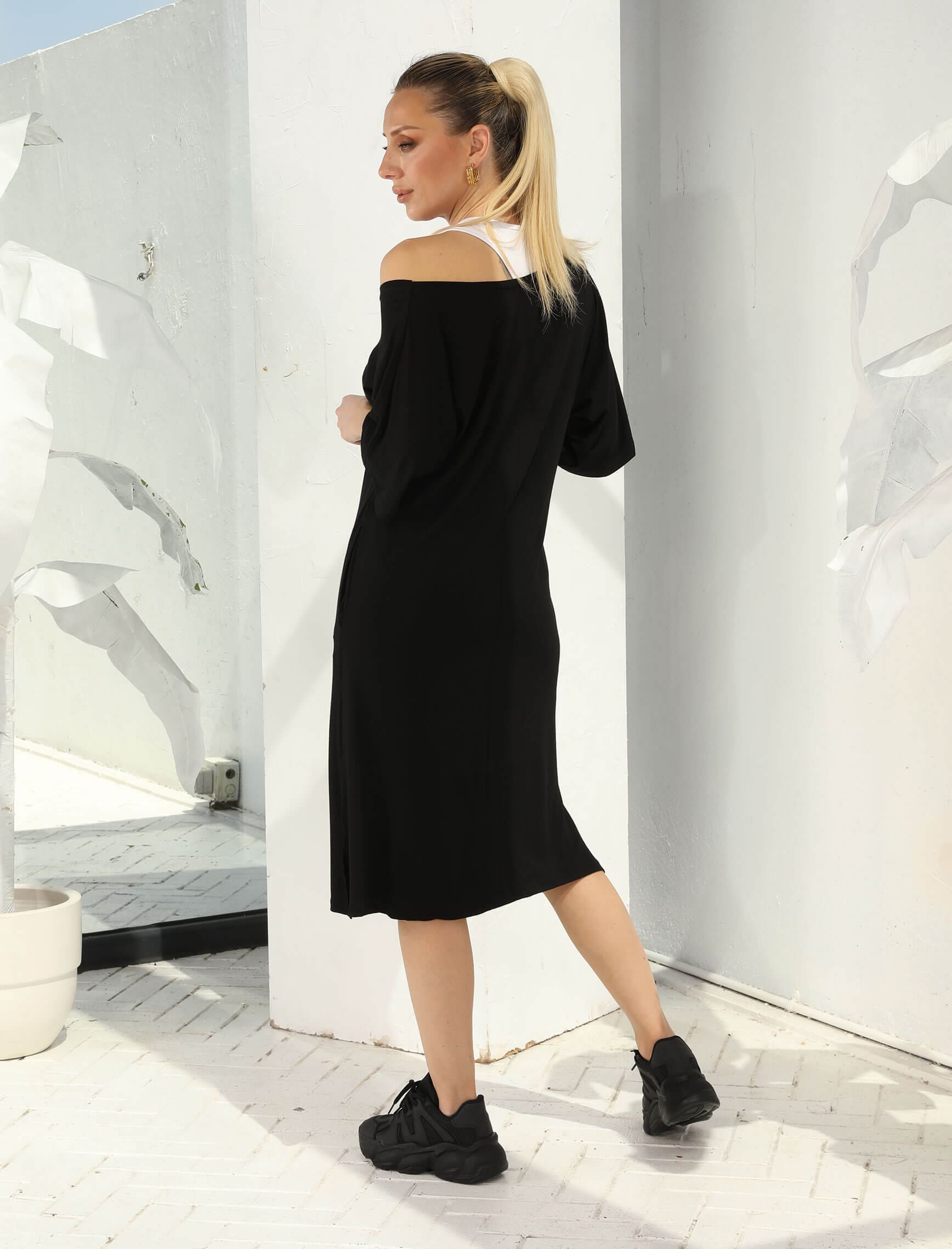 Beyaz Atletli Siyah İkili Orta Boy Elbise
