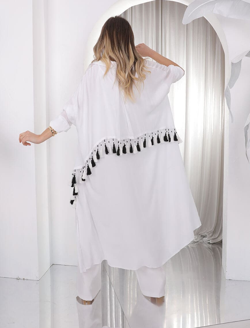 Beyaz Sırt Püskül Uzun Gömlek Kimono