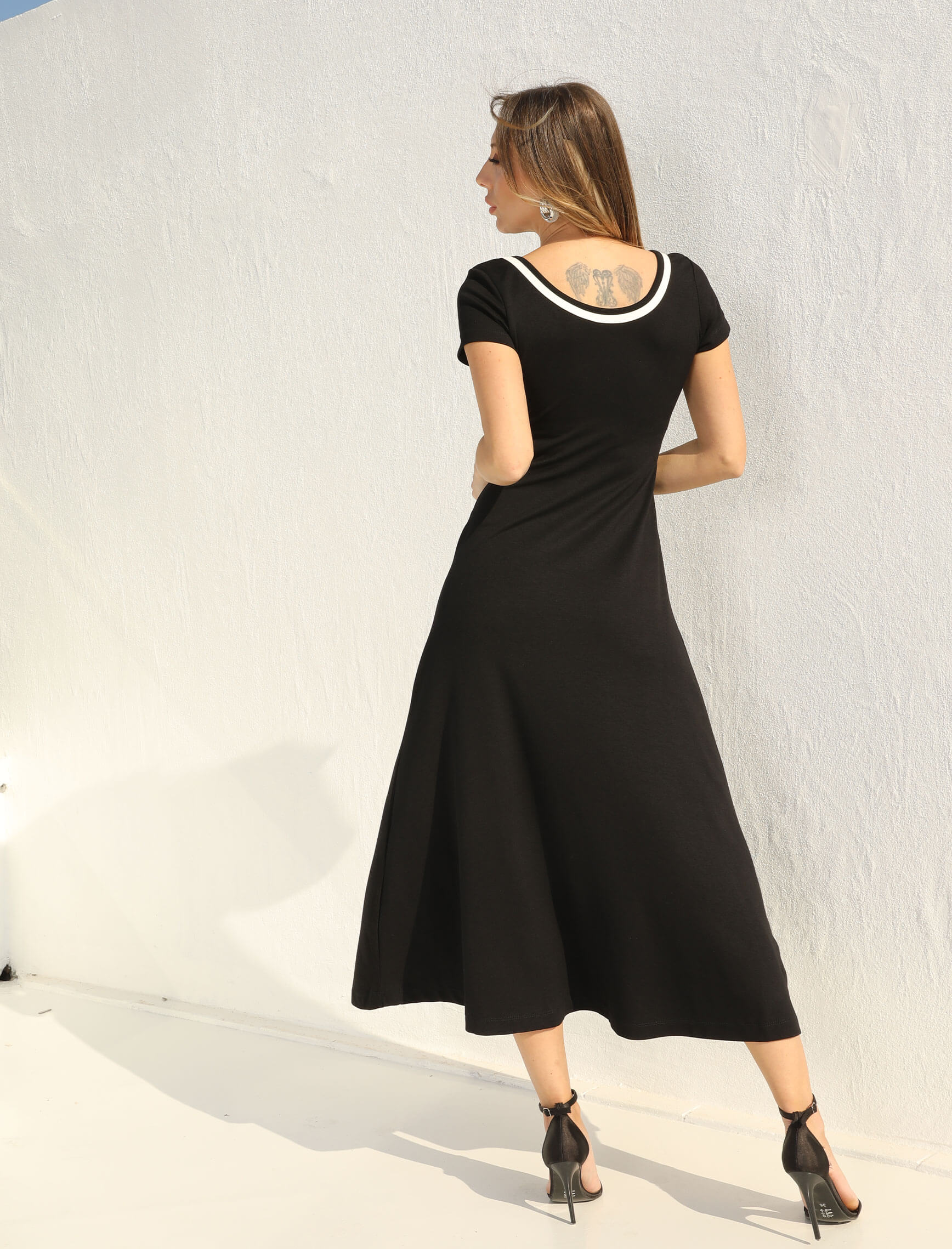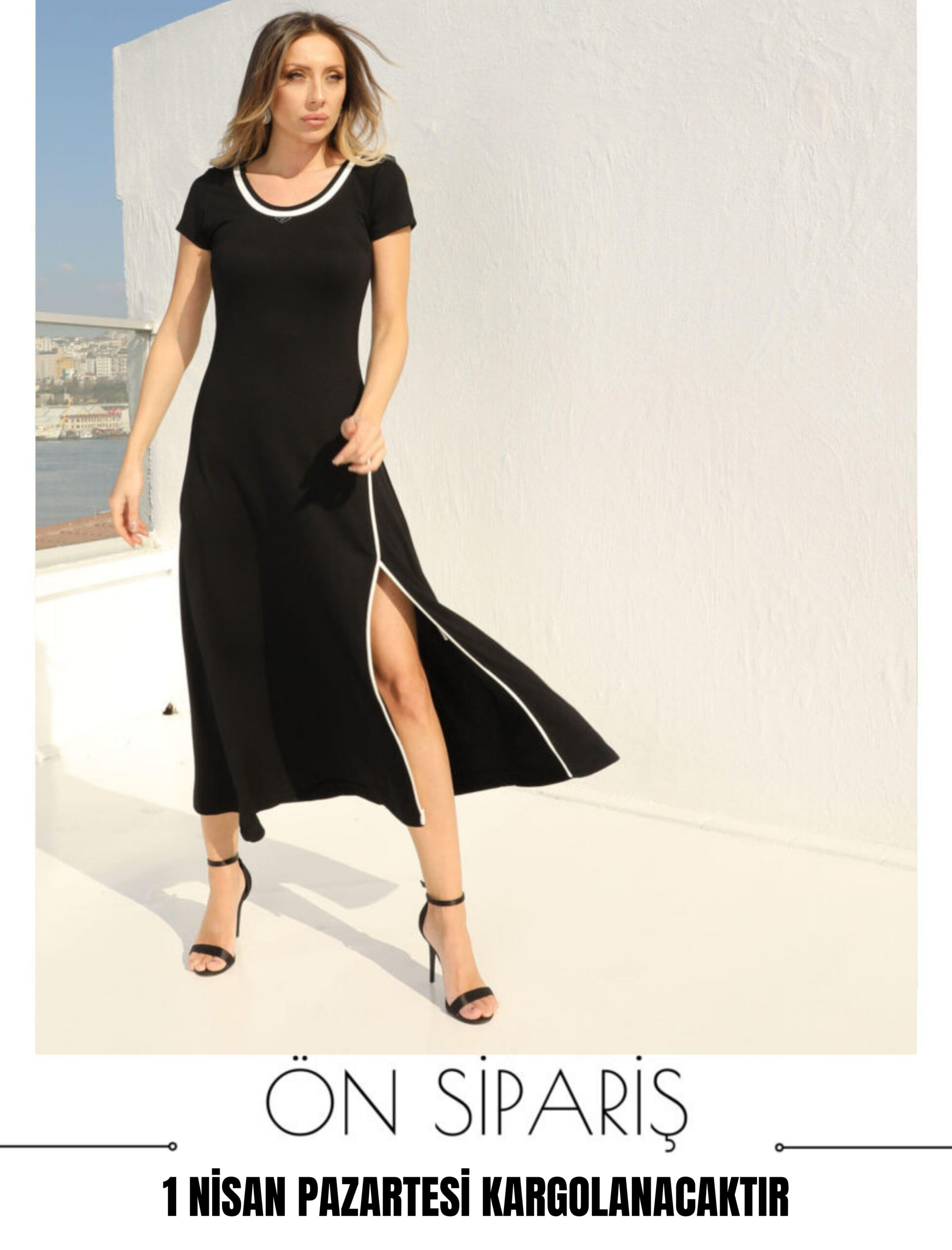Beyaz Şerit Detay Yırtmaçlı Elbise