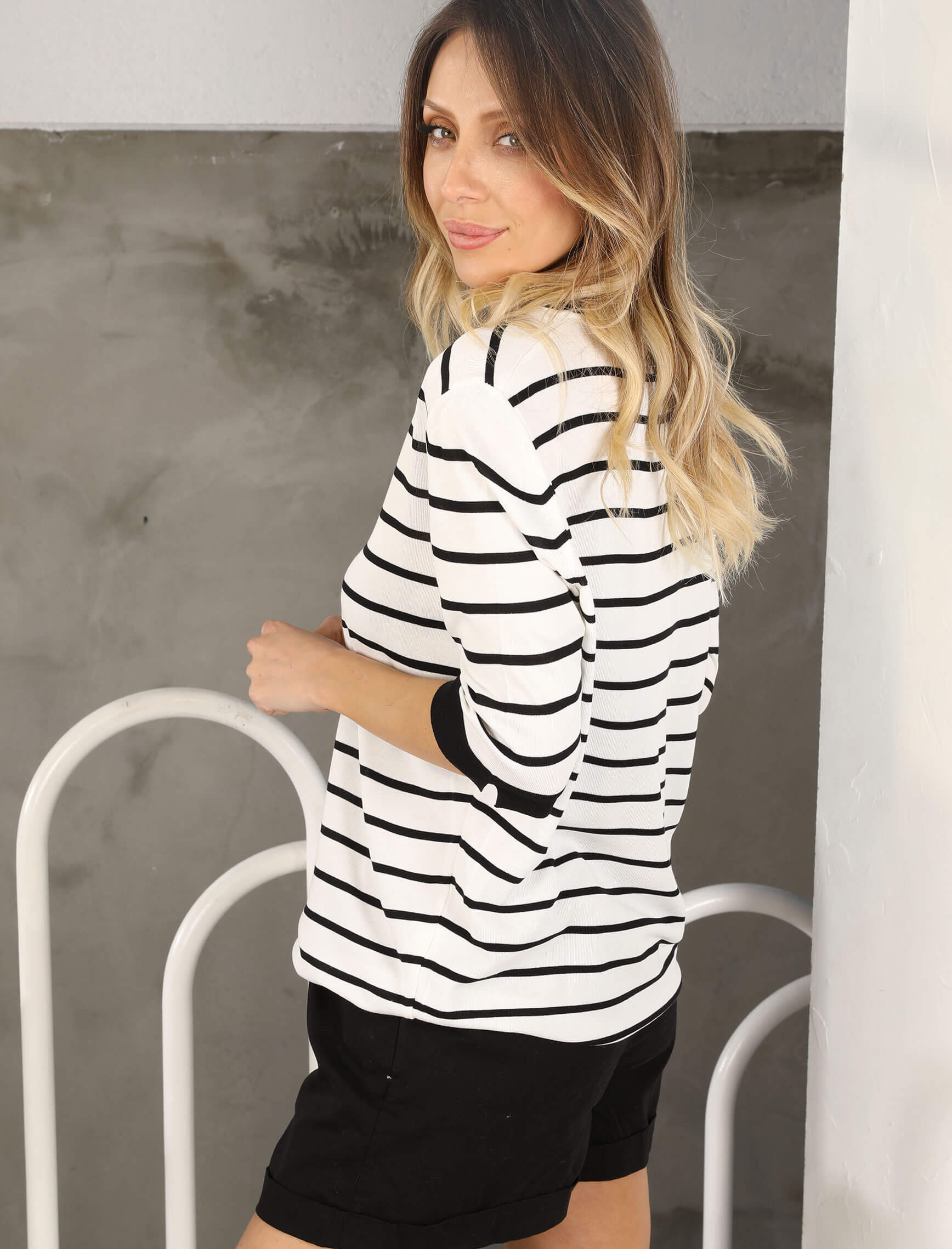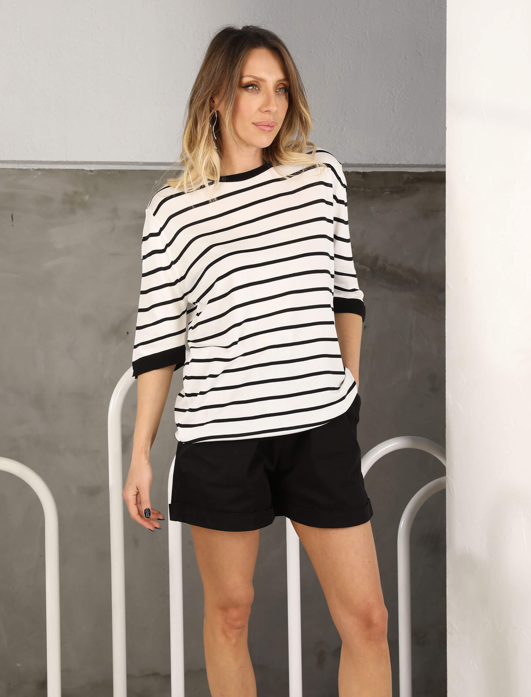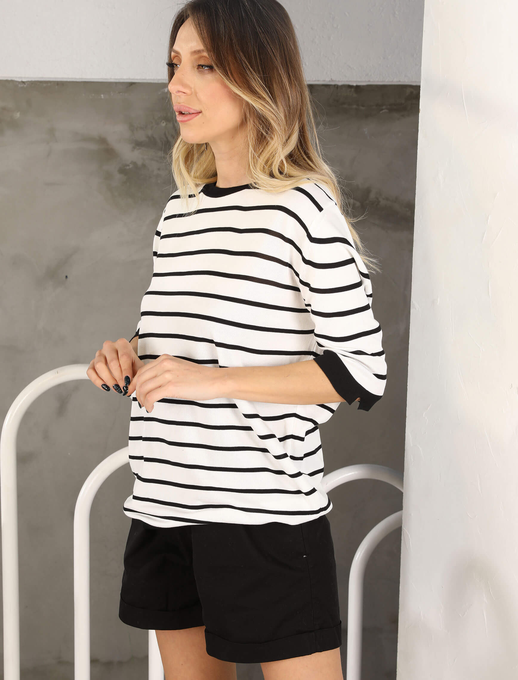 Beyaz Siyah Çizgi Bisiklet Yaka Triko