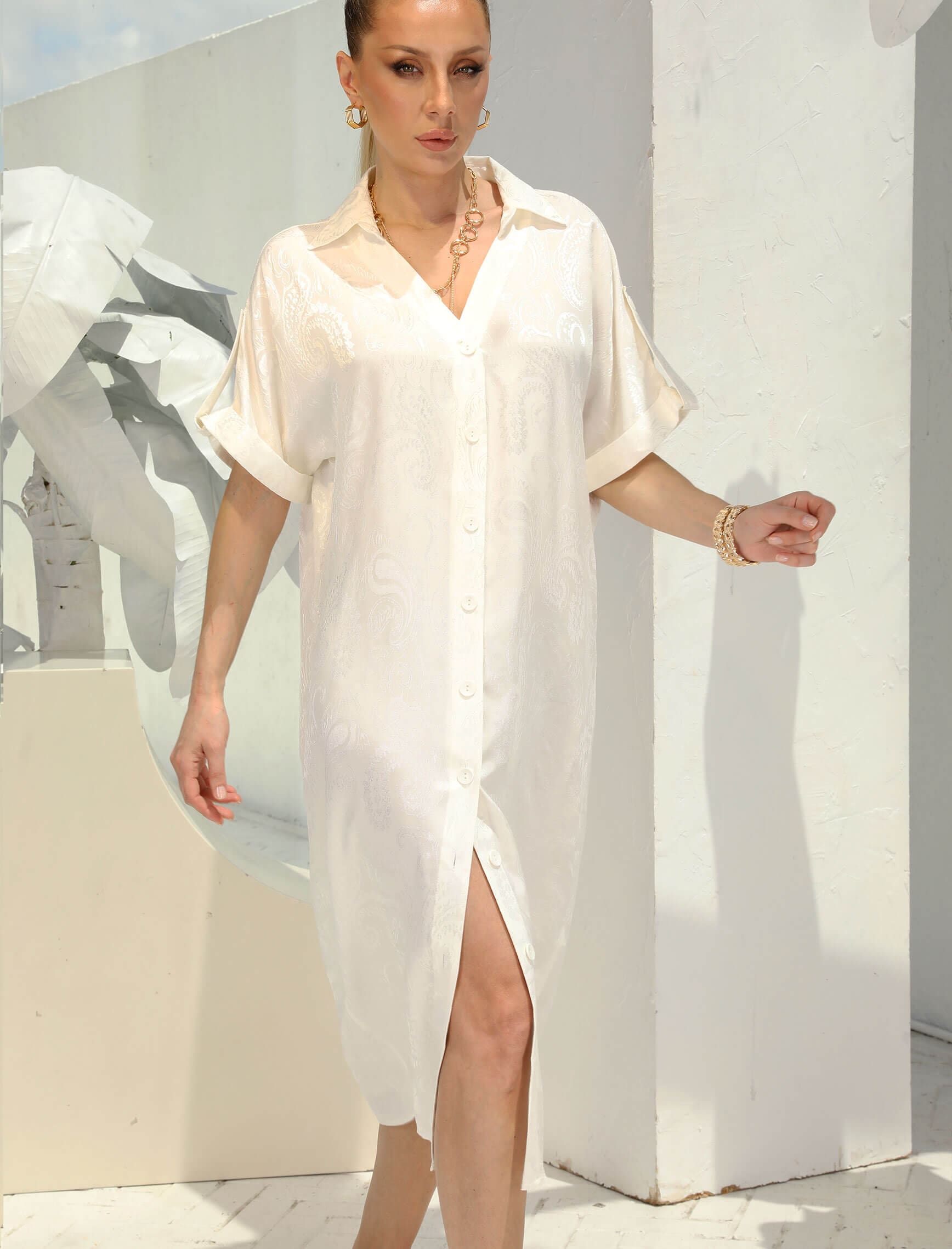 Ekru Şal Desen Jakar Saten Elbise