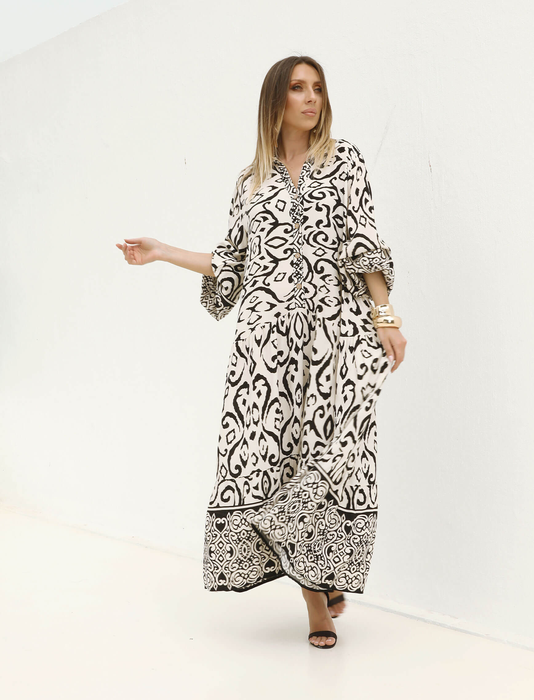Ekru Siyah Desen Tiante Elbise