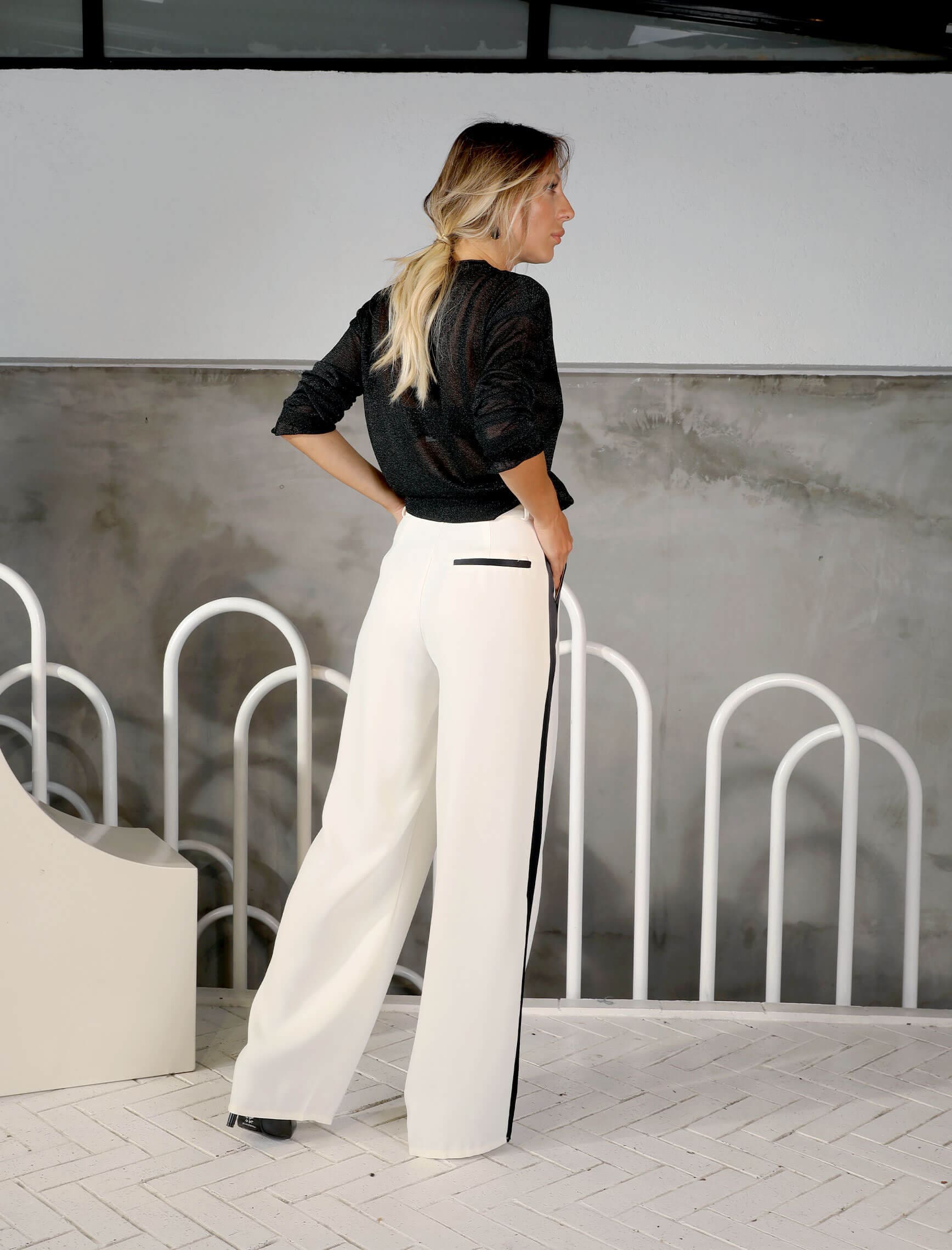 Ekru Siyah Saten Şerit Palazzo Pantolon