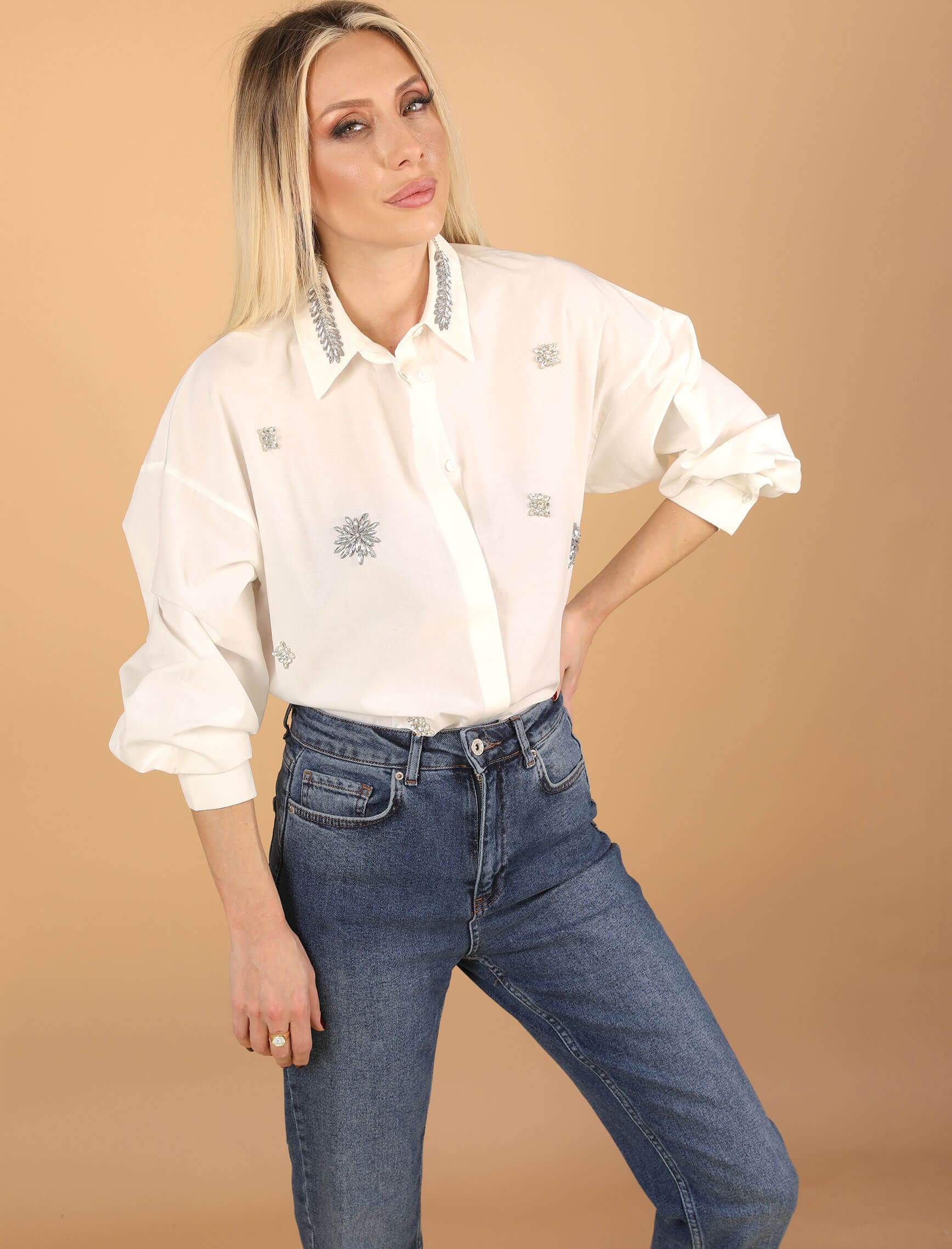 Ekru Yaka Yaprak Taş İşleme Gömlek