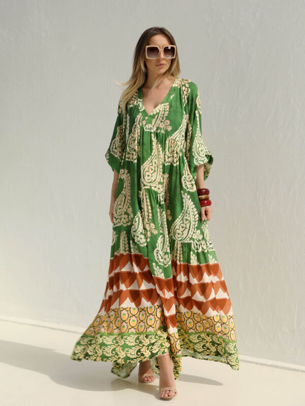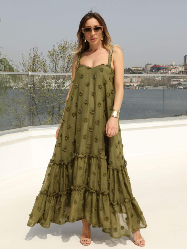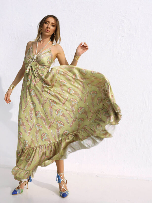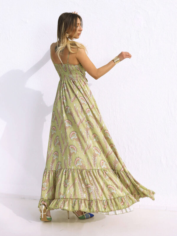 Yağyeşili Askılı Şal Desen Elbise