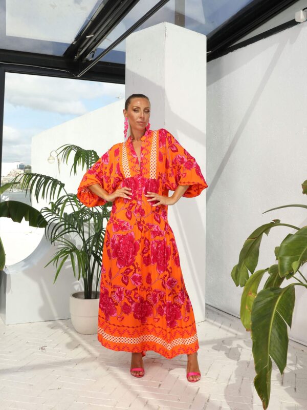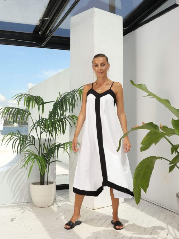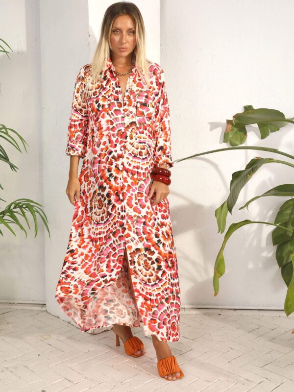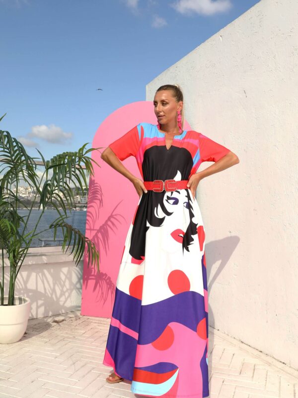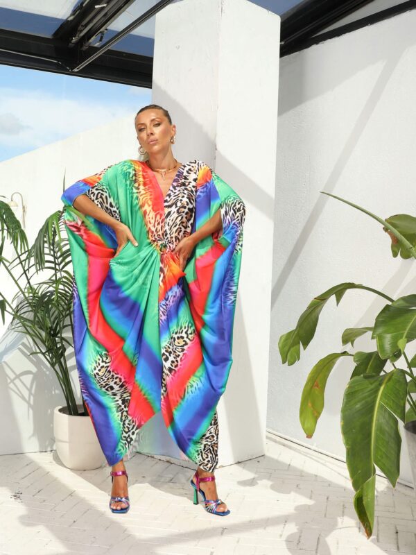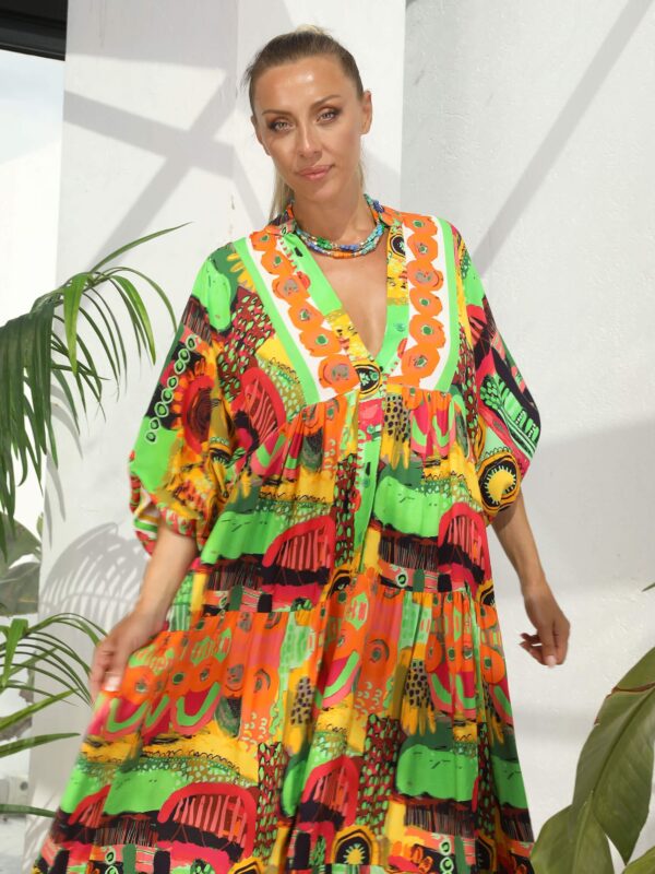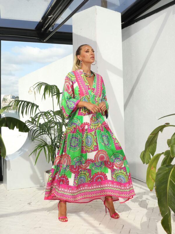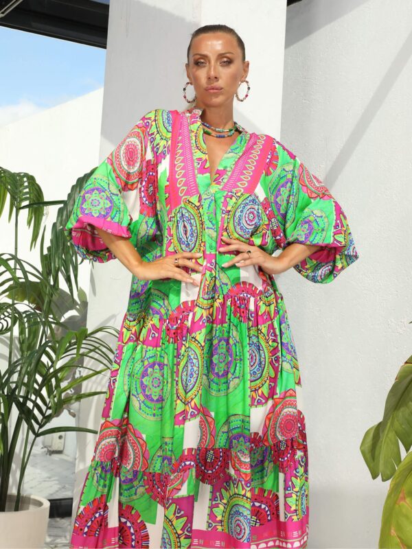 Yeşil Ekru Motifli Halter Yaka Elbise