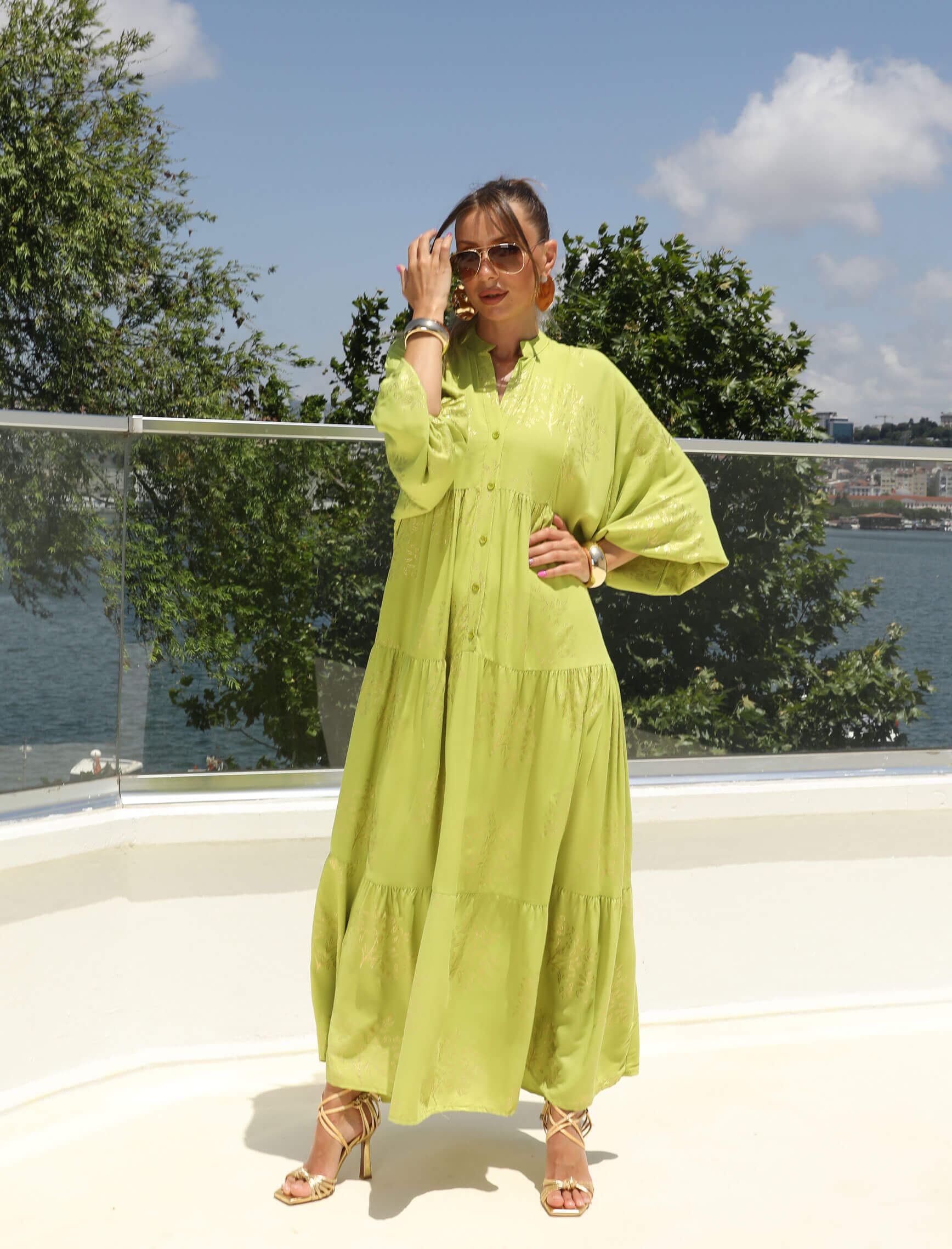 Fıstık Yeşili Gold Lak Yaprak Desen Elbise