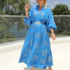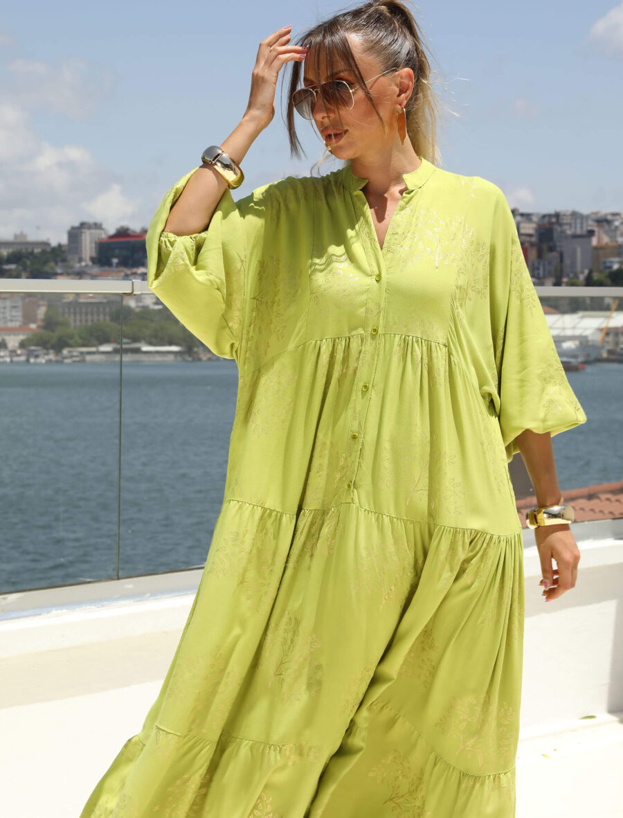 Fıstık Yeşili Gold Lak Yaprak Desen Elbise