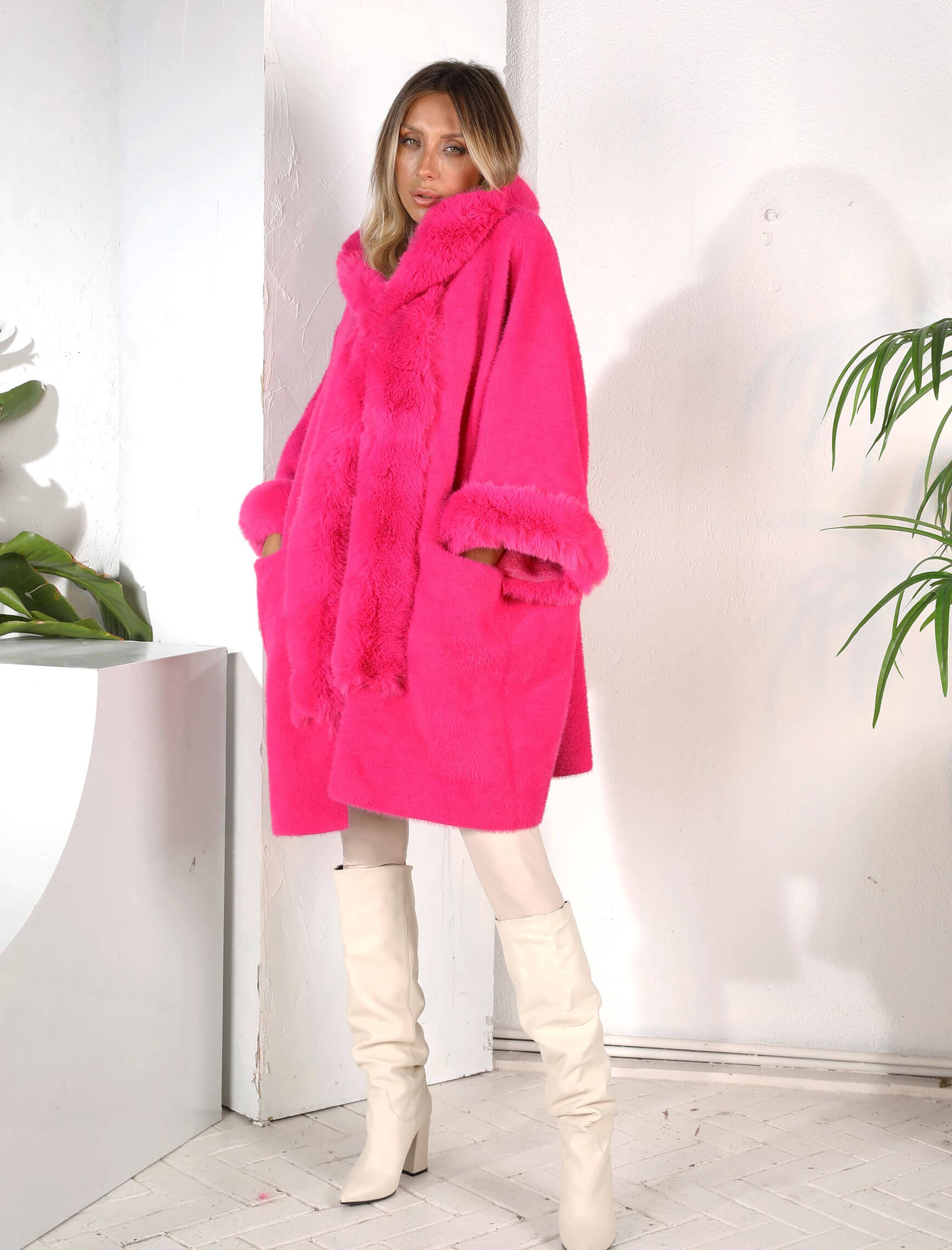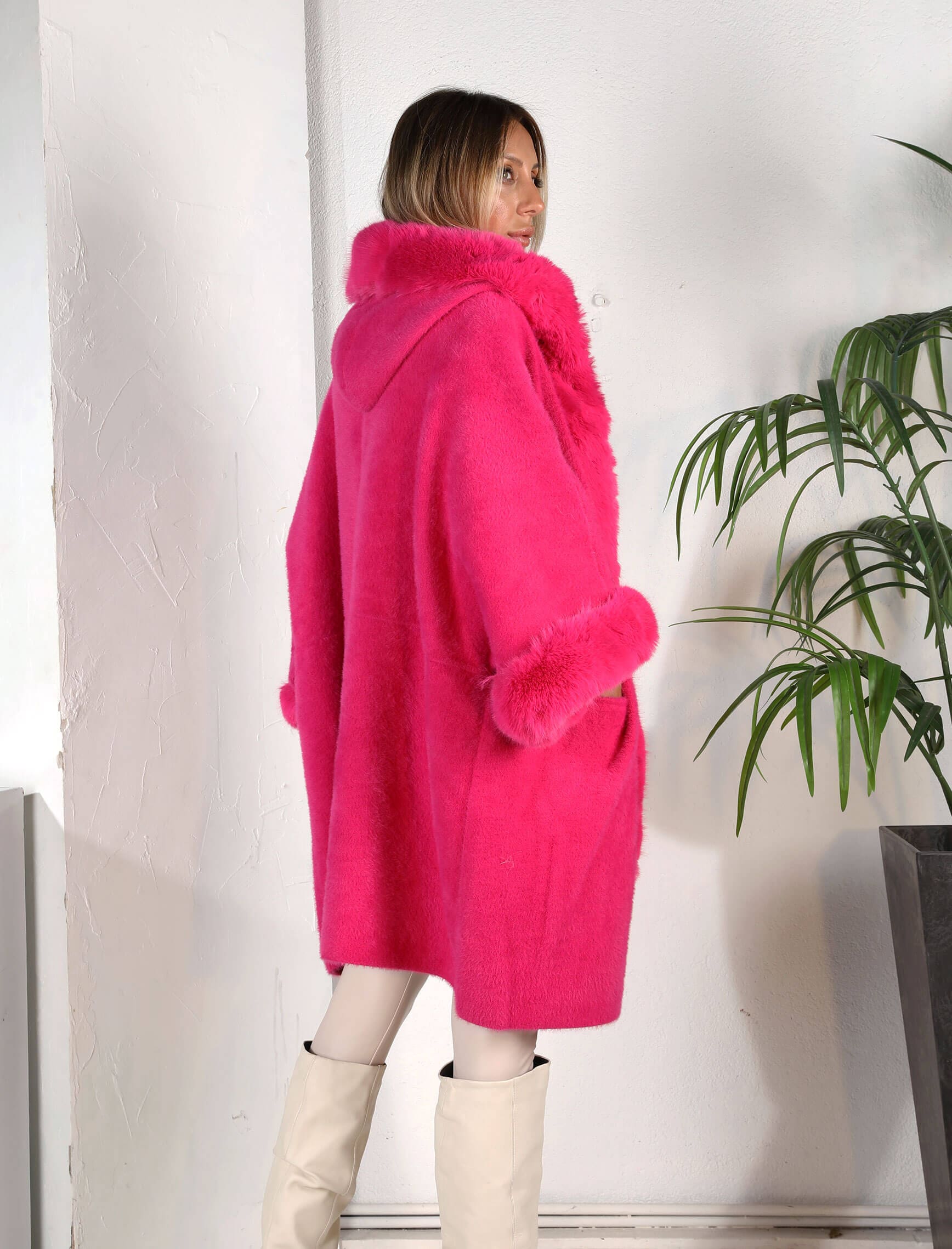 Fuşya Kapüşonlu Angora Kaban