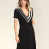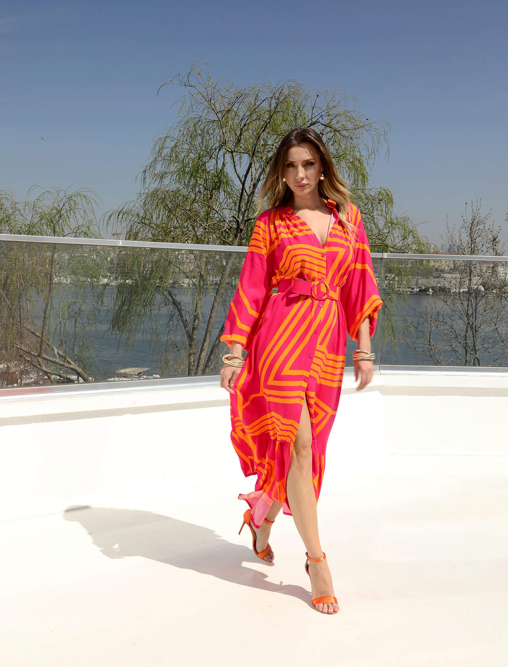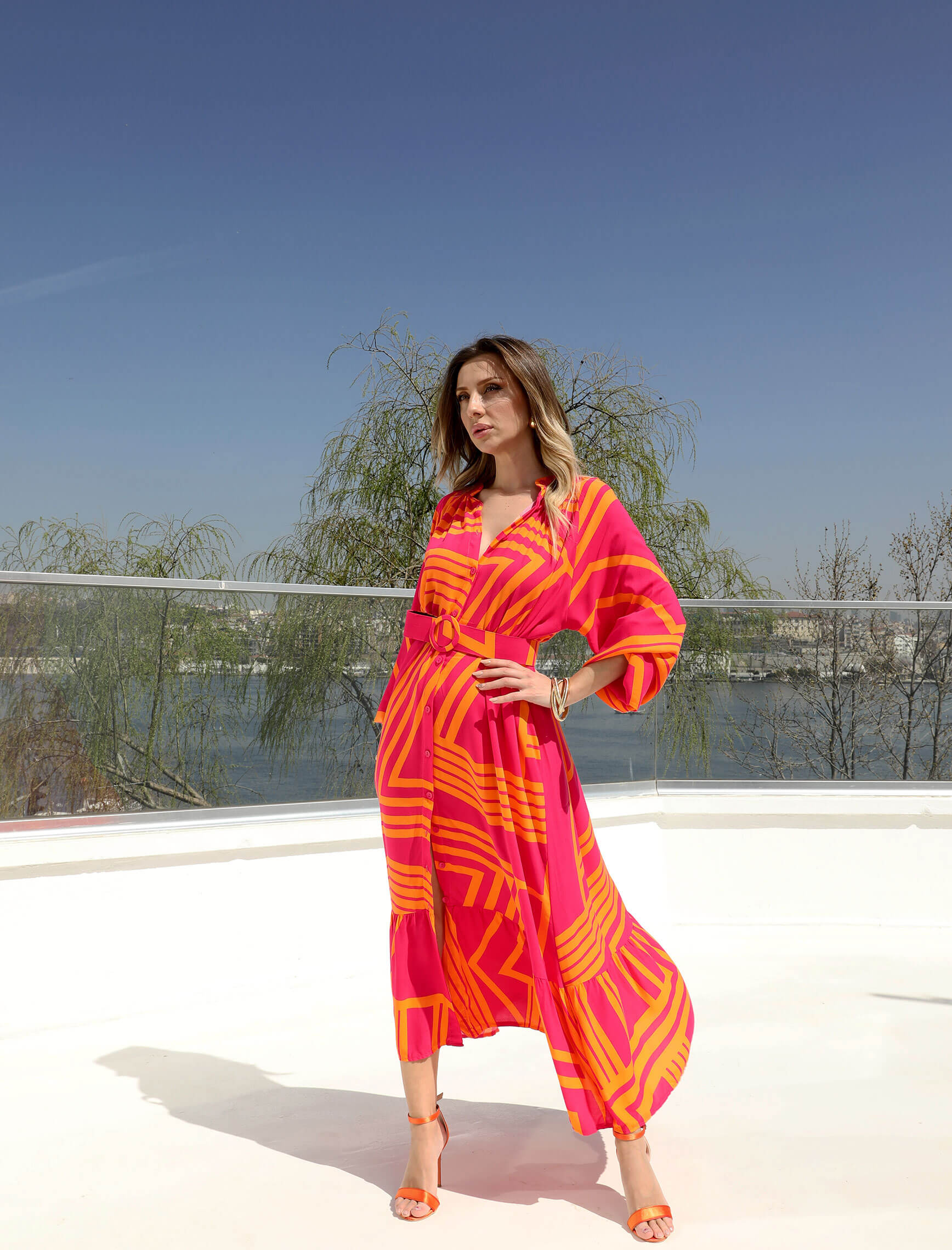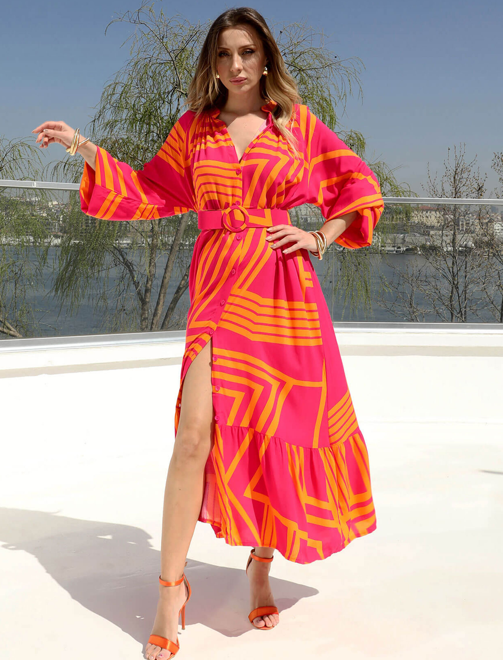 Fuşya Turuncu Çizgi Desen Kemerli Elbise