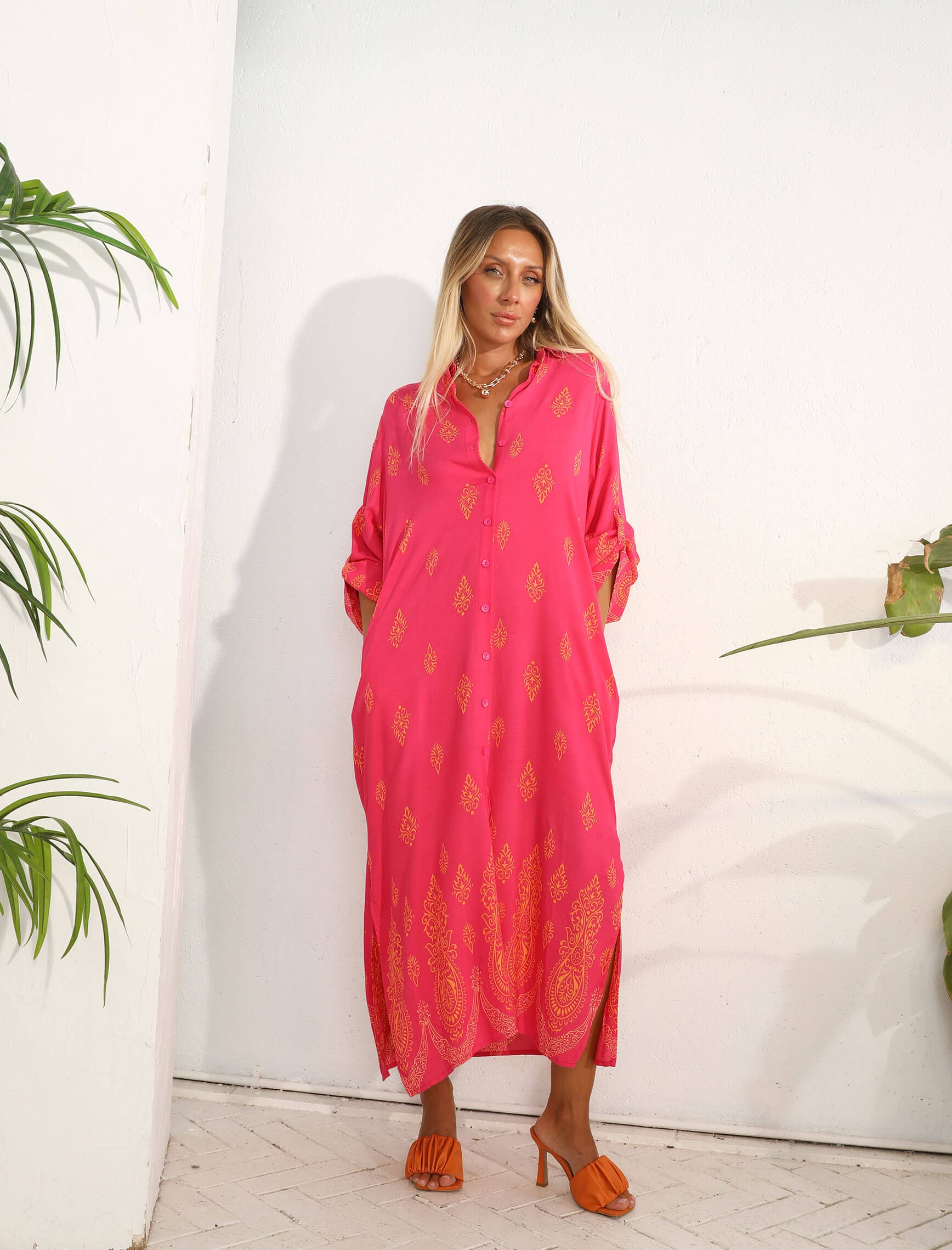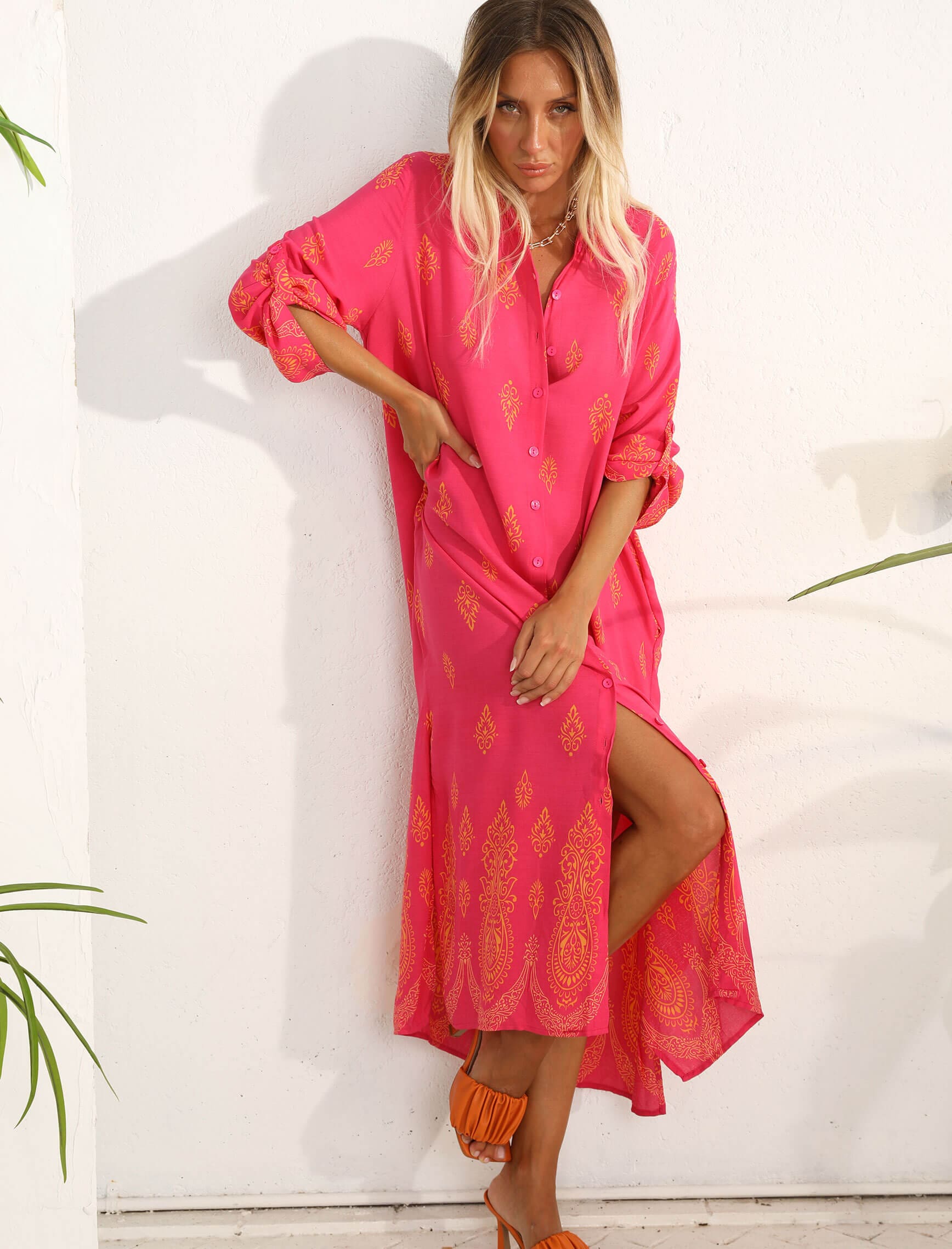 Fuşya Turuncu Hindistan Gömlek Elbise