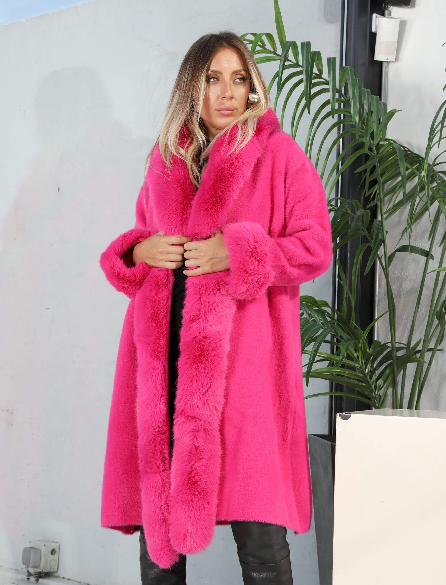 Fuşya Yaka Cep Kürk Angora Kaban