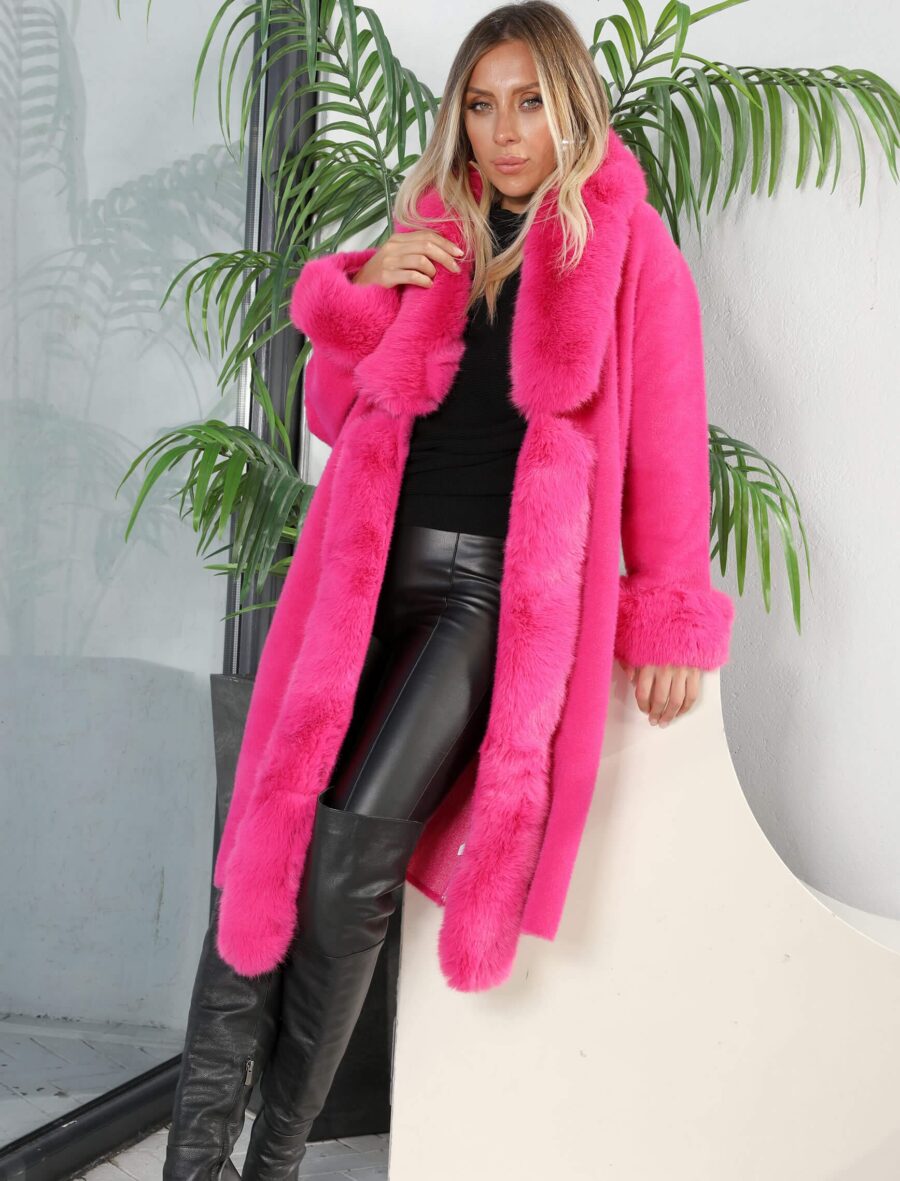 Fuşya Yaka Cep Kürk Angora Kaban