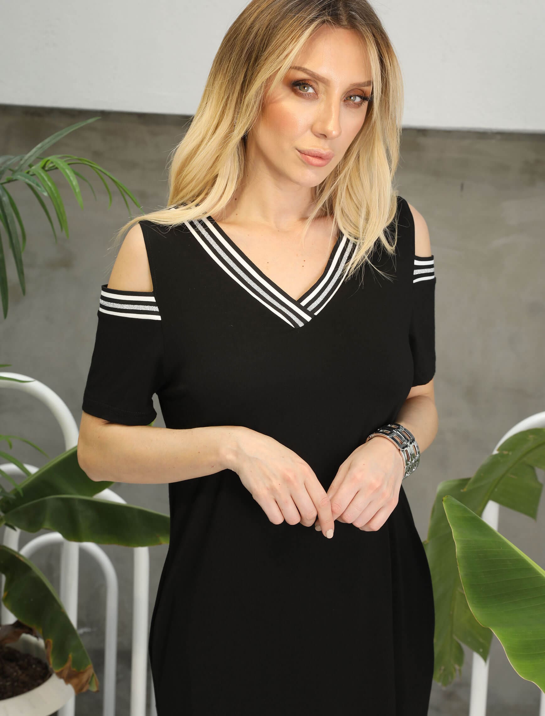 Gümüş Ribana Şerit Omuz Dekolte Elbise