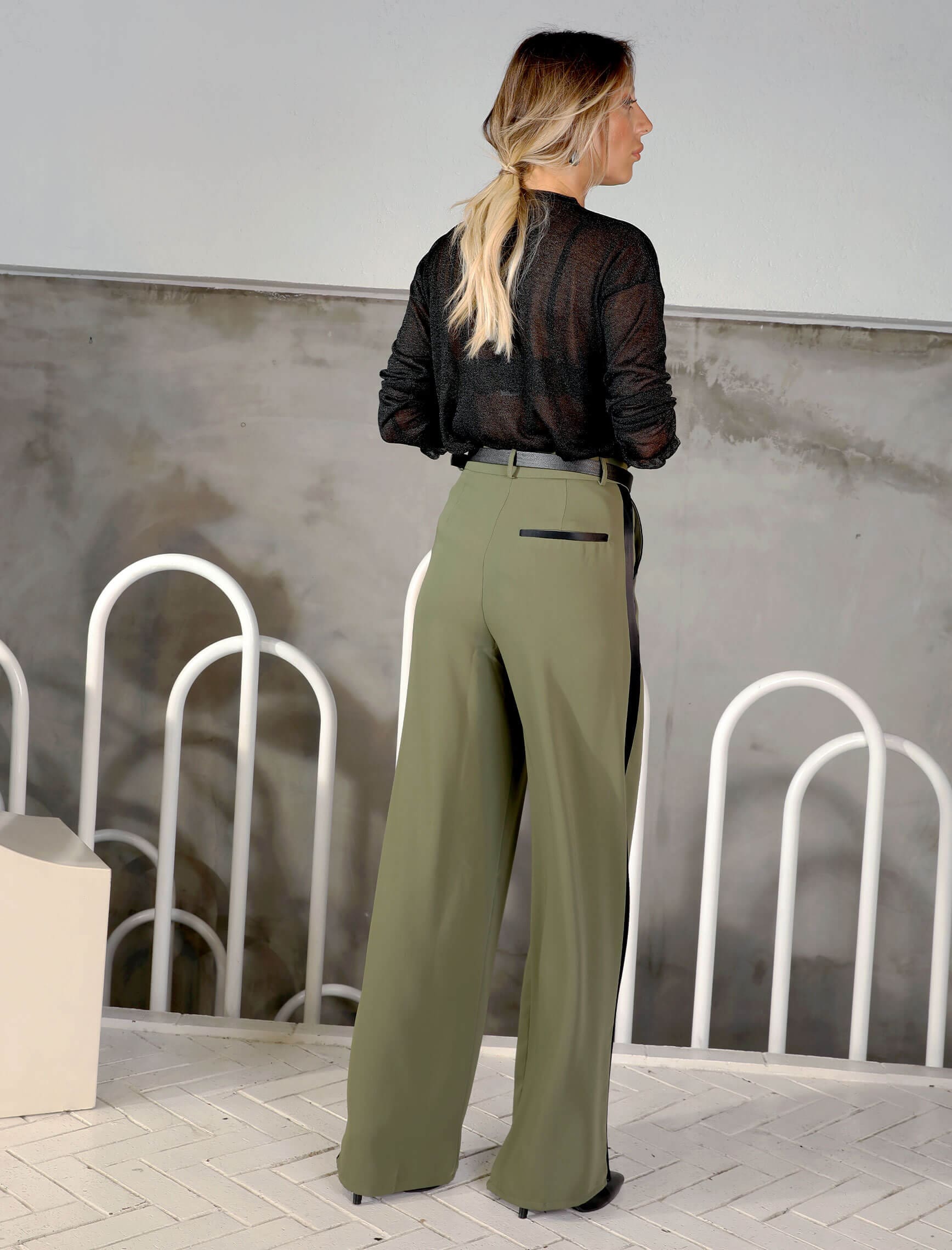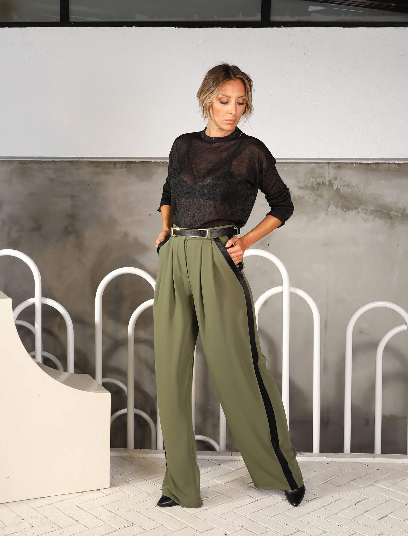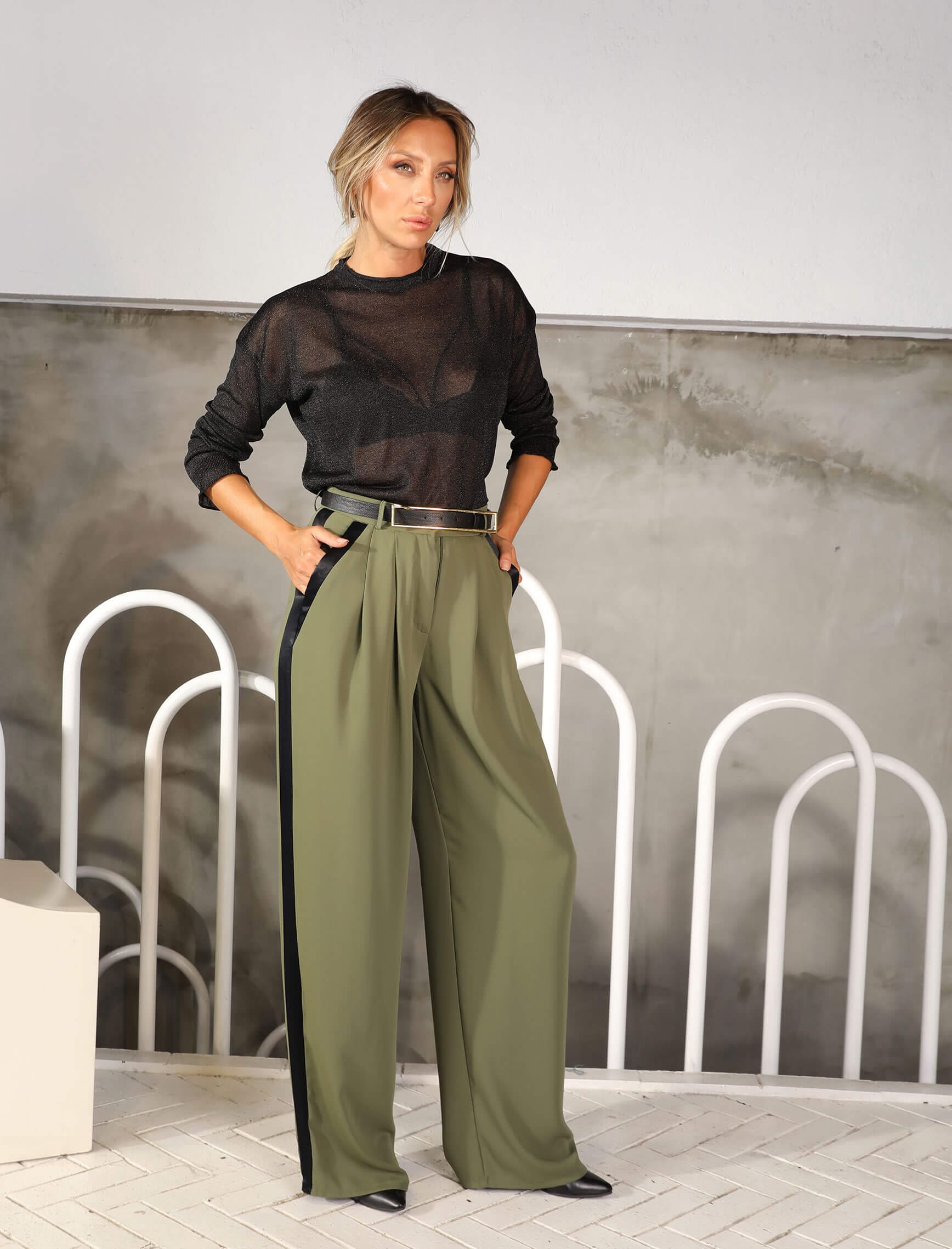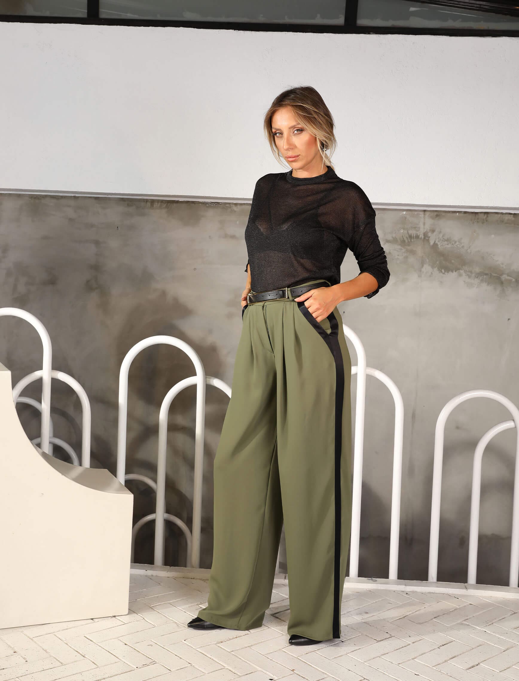 Haki Siyah Saten Şerit Palazzo Pantolon