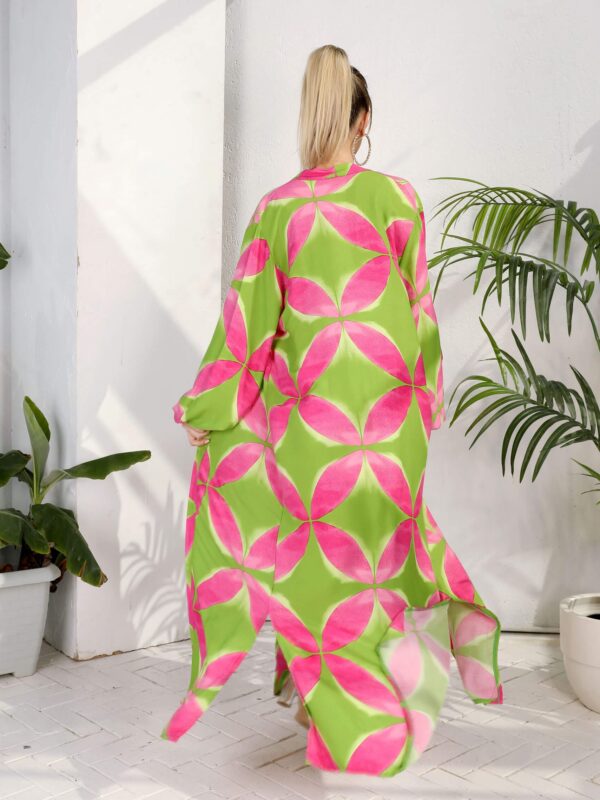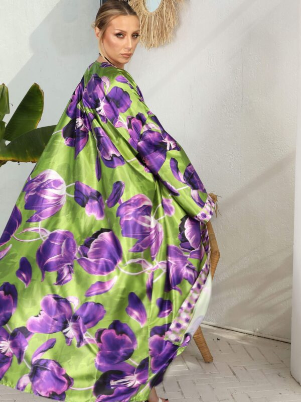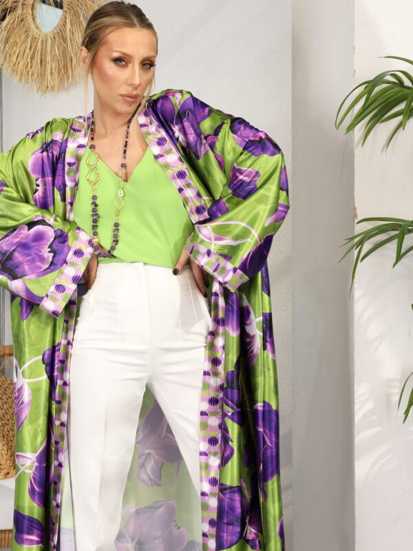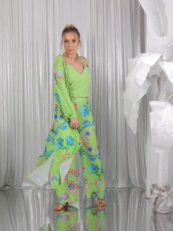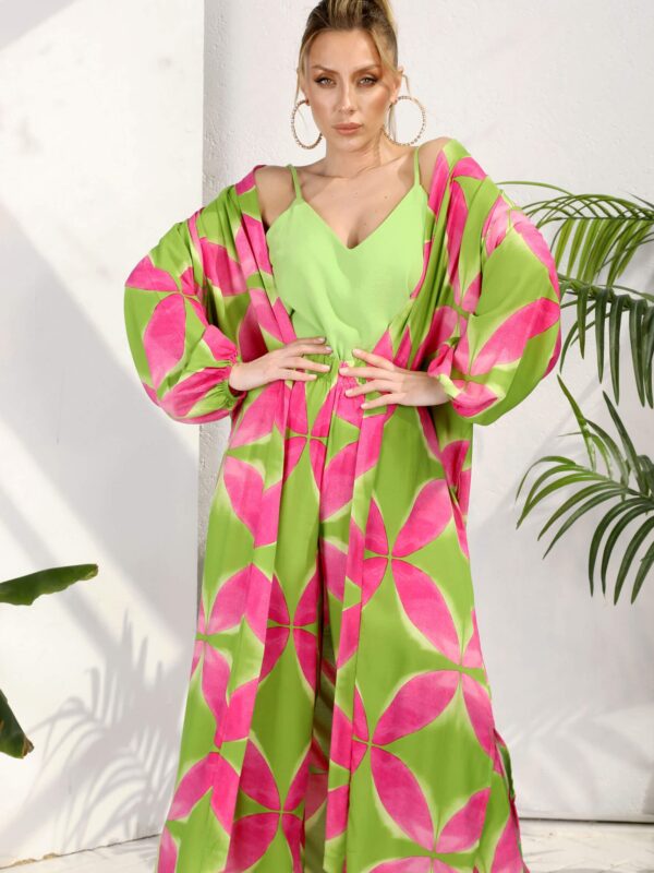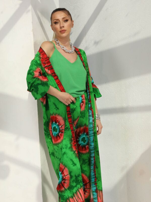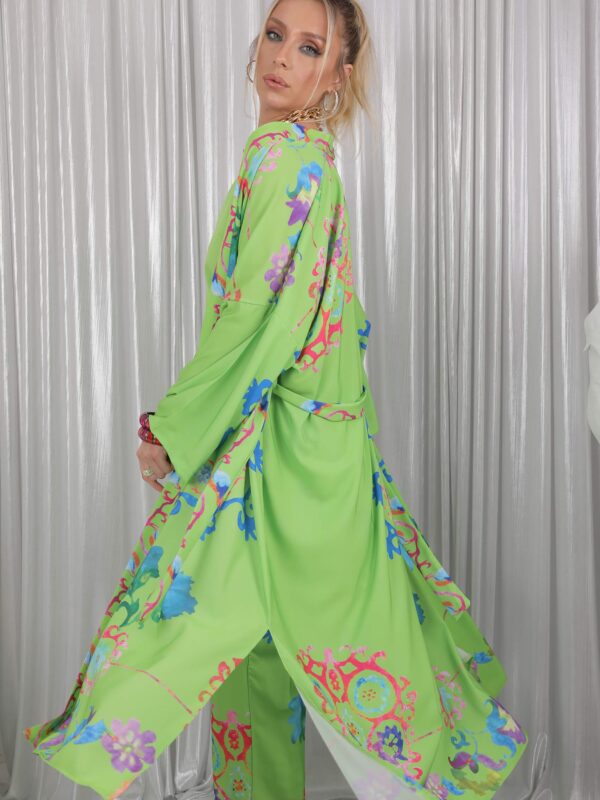 Fıstık Yeşili Ebruli Çiçek Desen Kimono Takım
