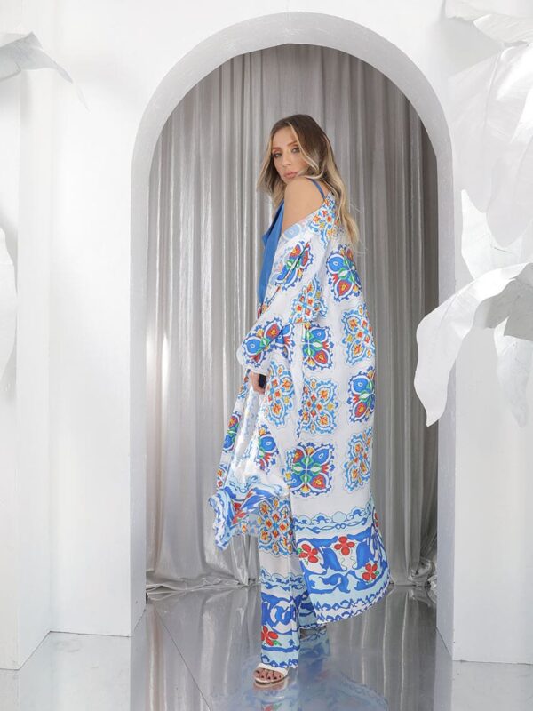 Beyaz Saks Dama Çini Desen Kimono Takım