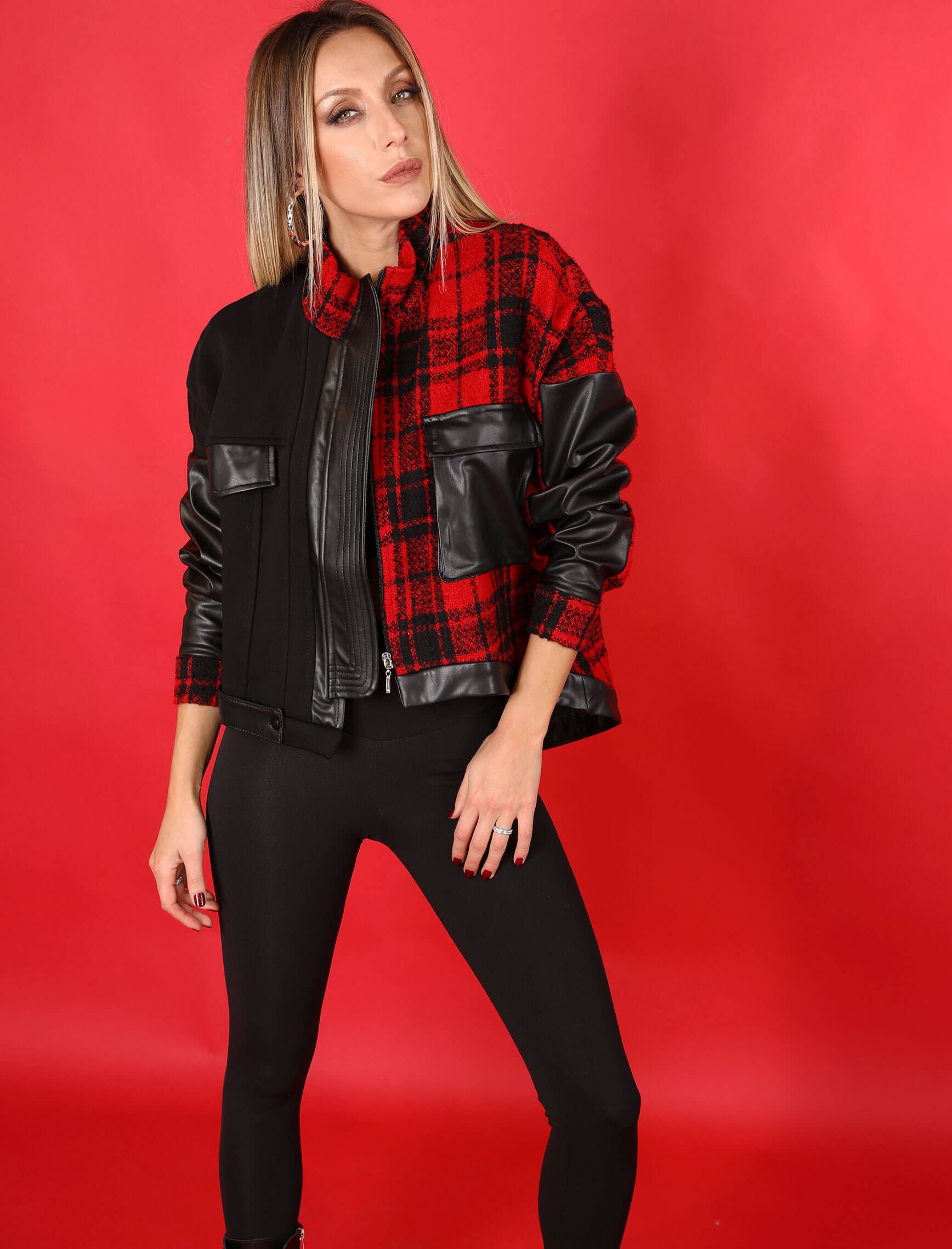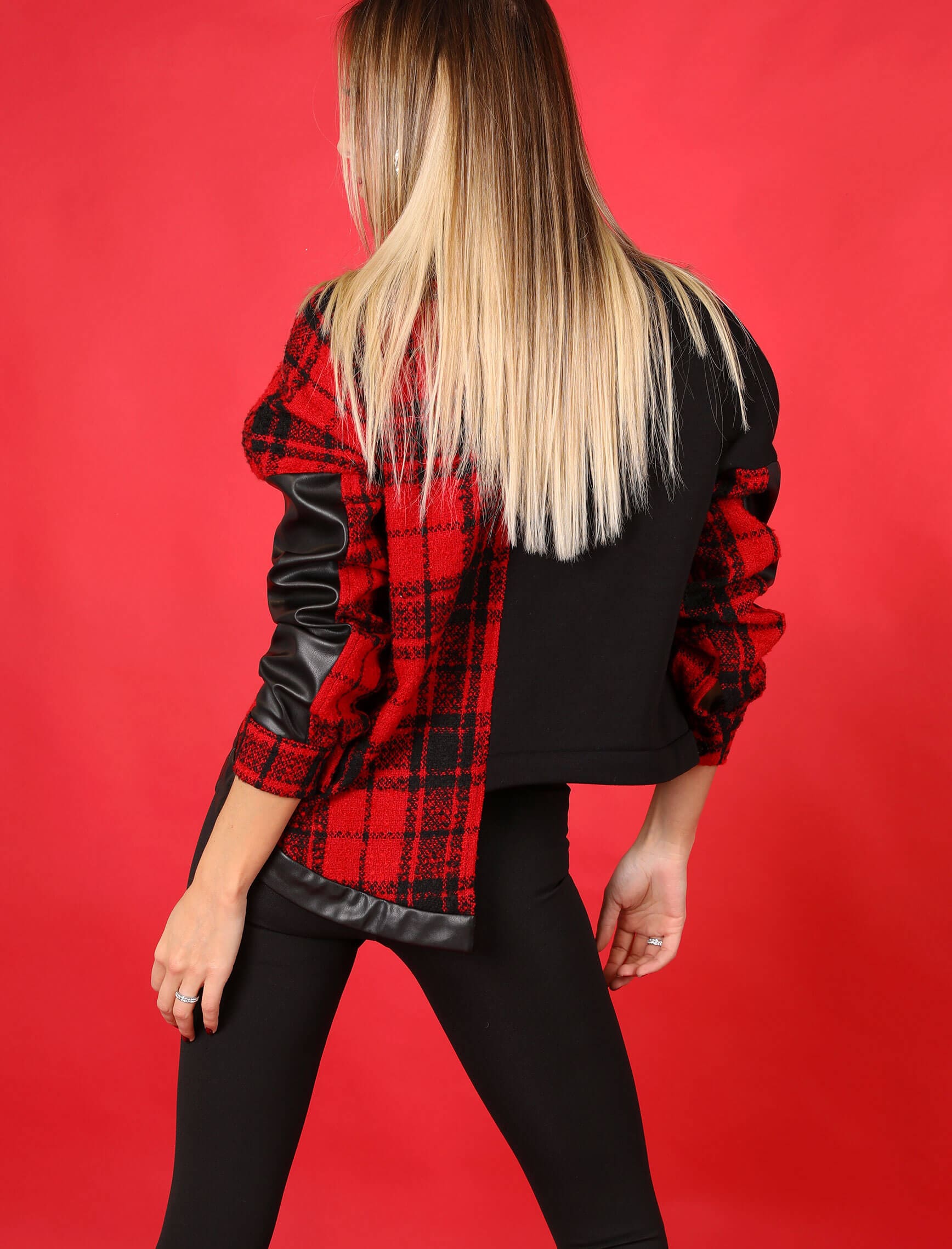 Kırmızı Ekose Siyah Deri Detay Mont