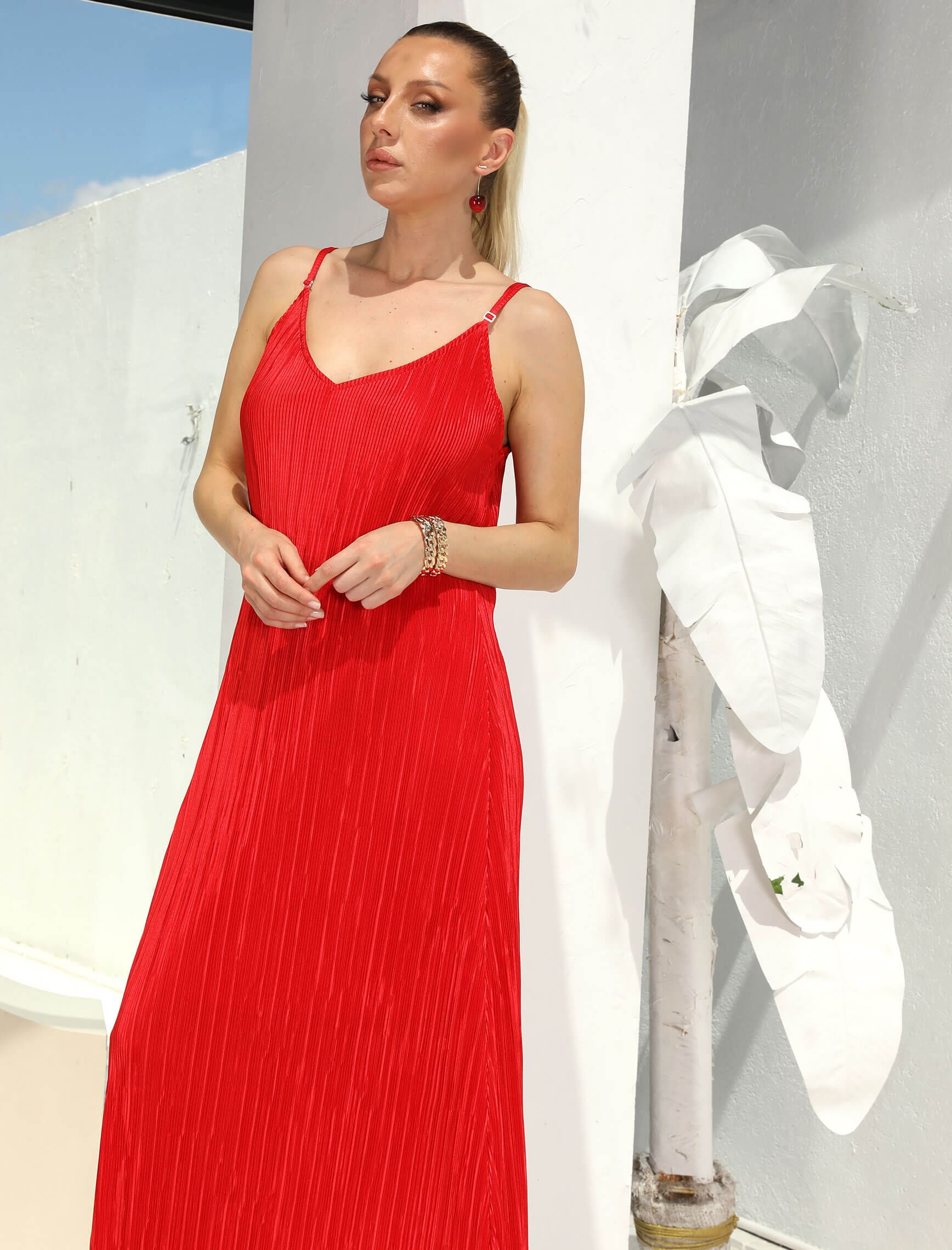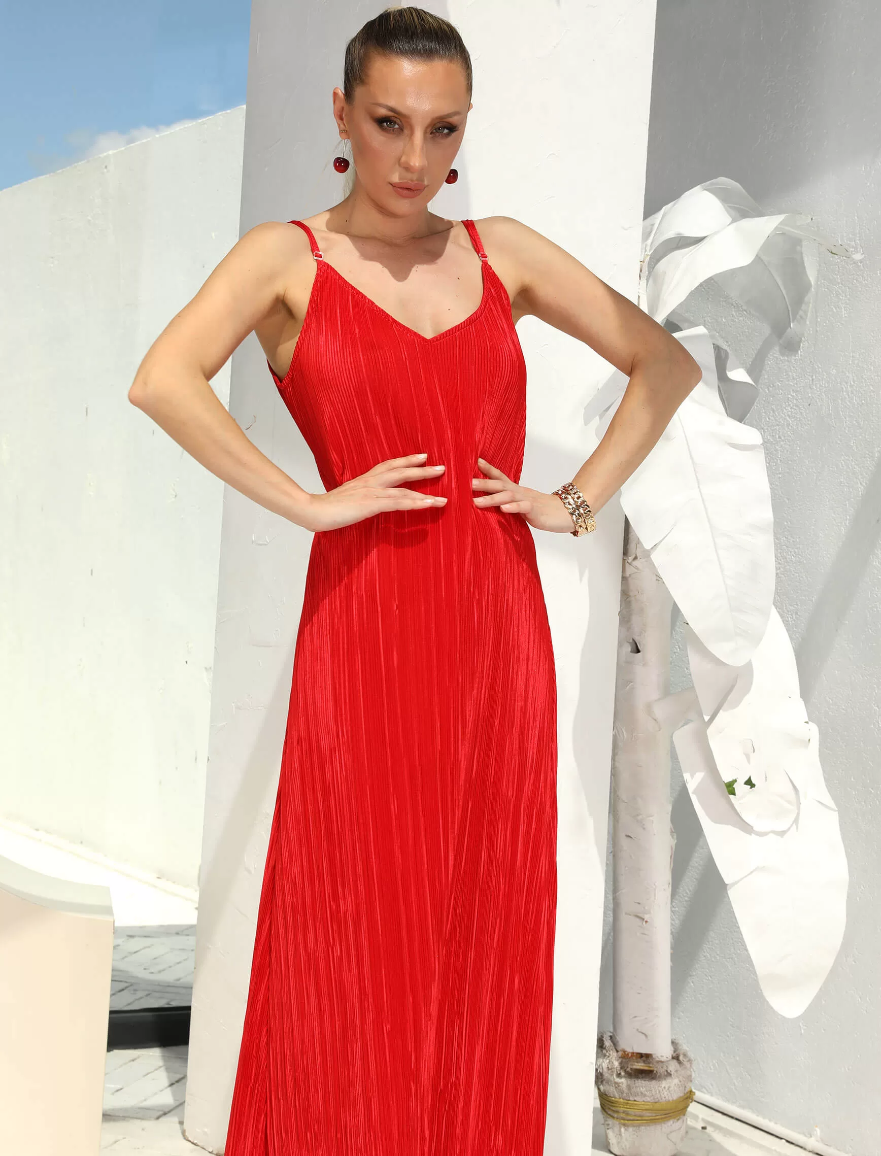 Kırmızı Krinkıl Askılı Elbise