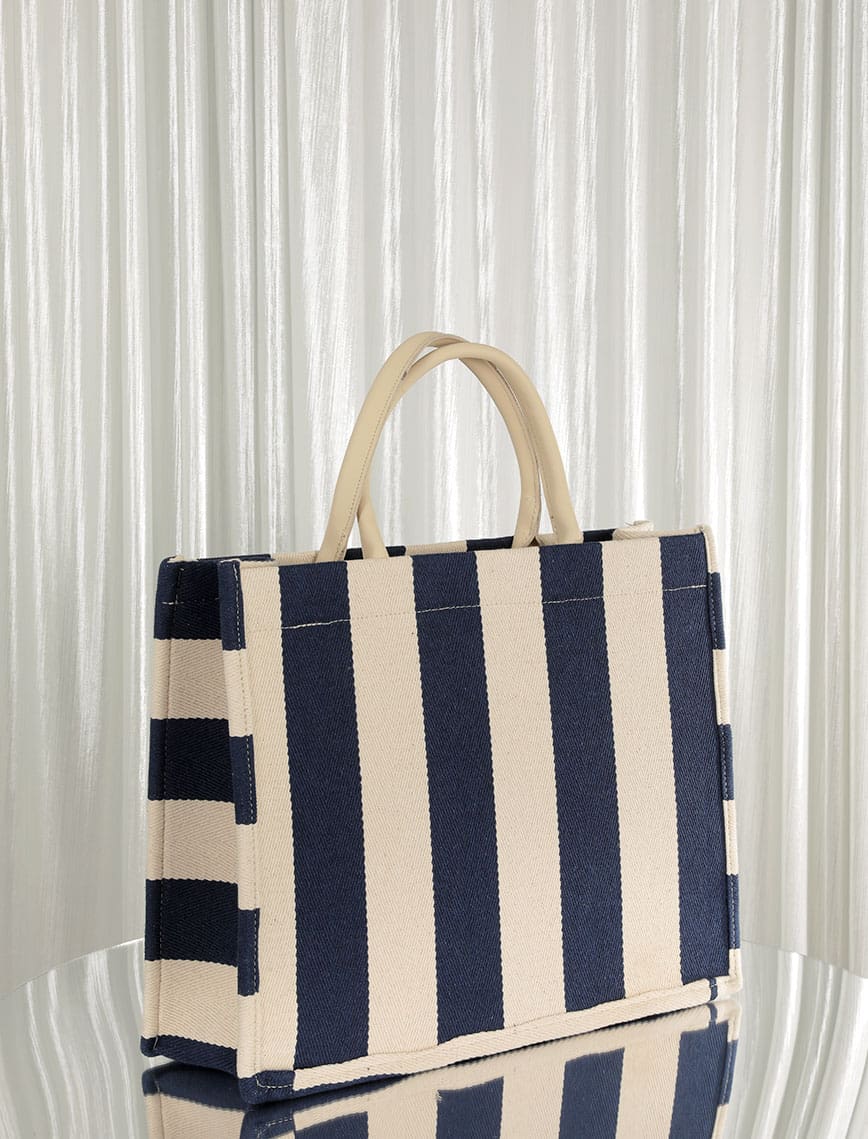 Lacivert Bej Kalın Çizgi Keten Çanta