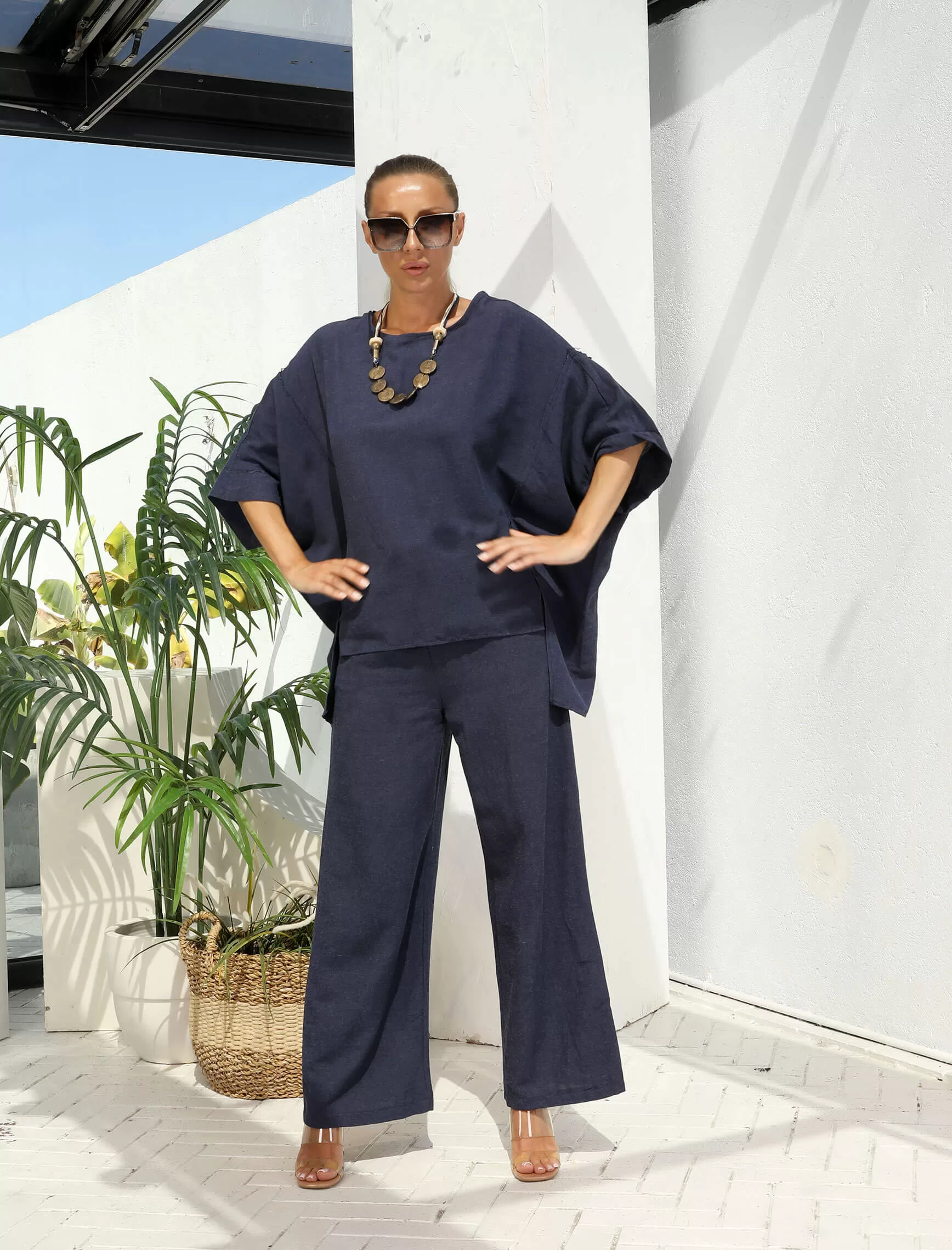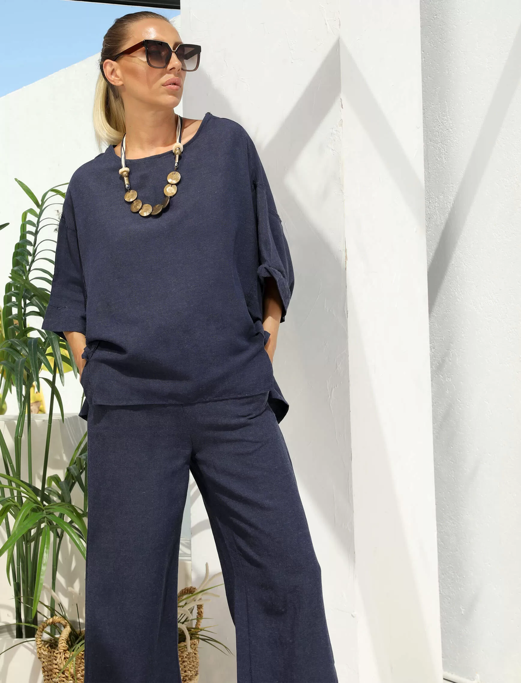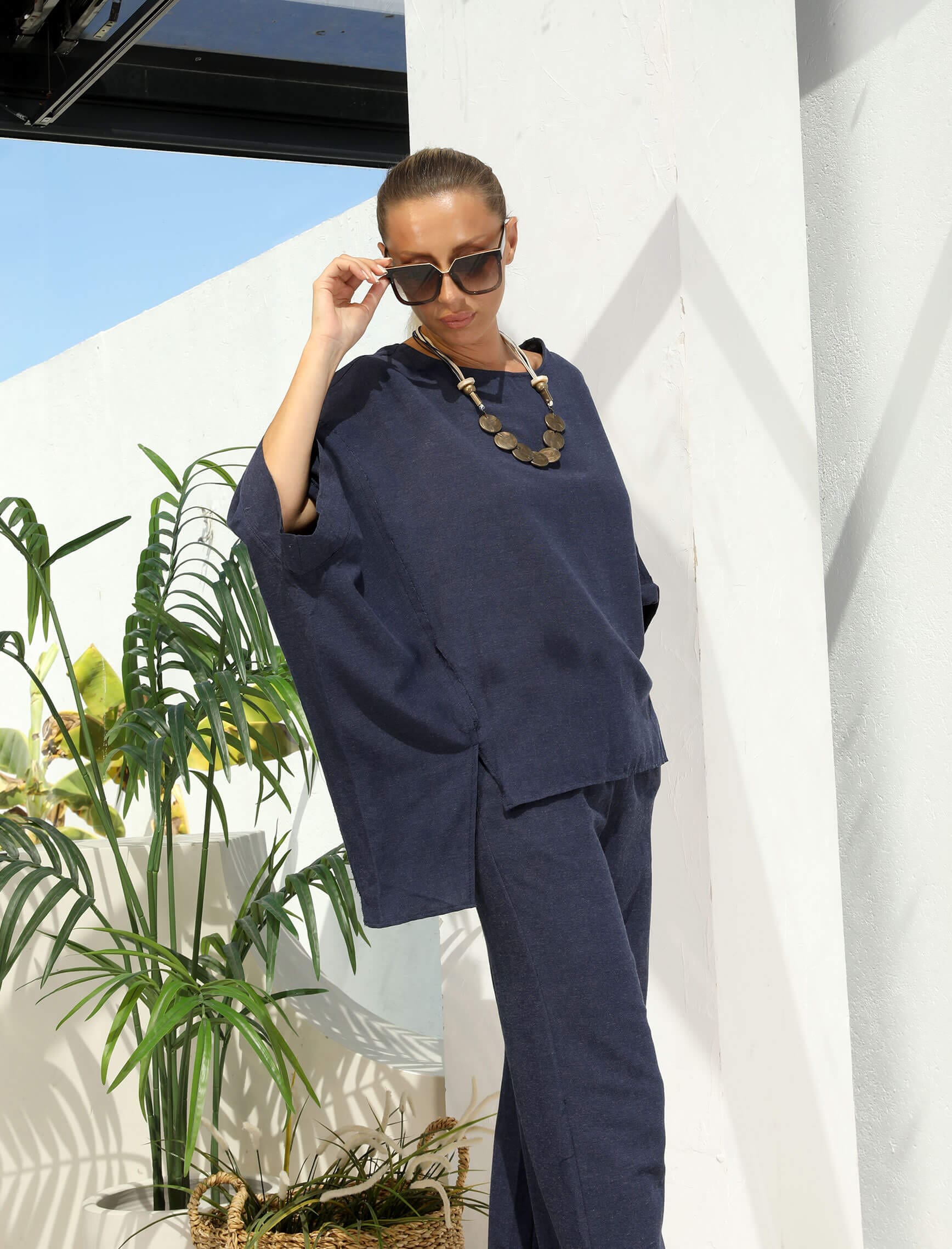 Lacivert İngiliz Dikiş Kolyeli Keten Takım