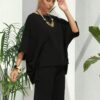 Lacivert İngiliz Dikiş Kolyeli Keten Takım