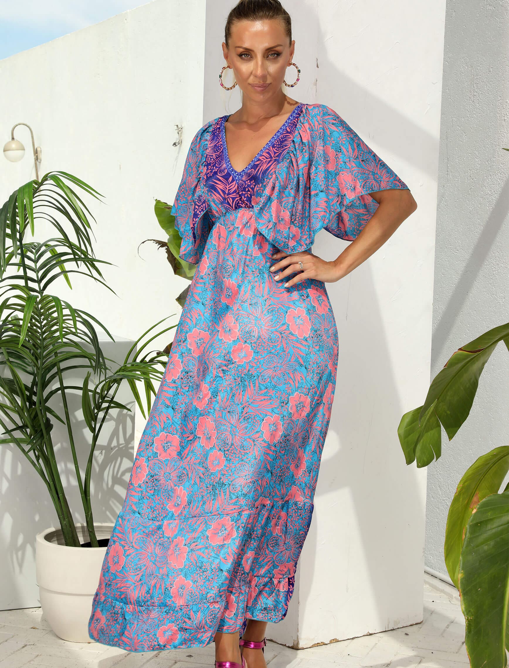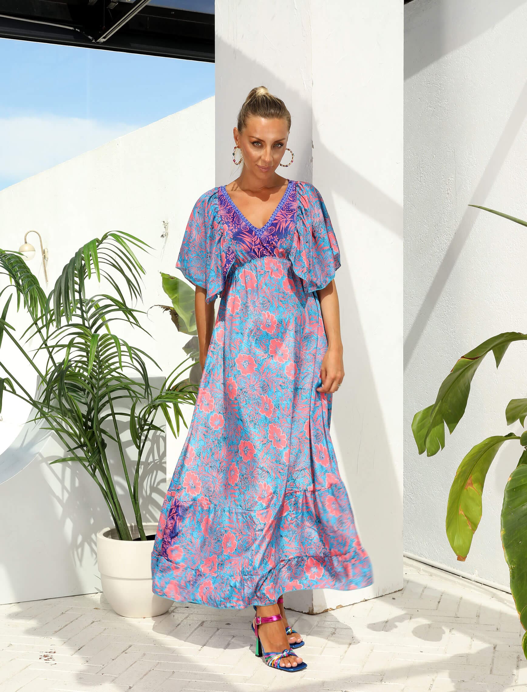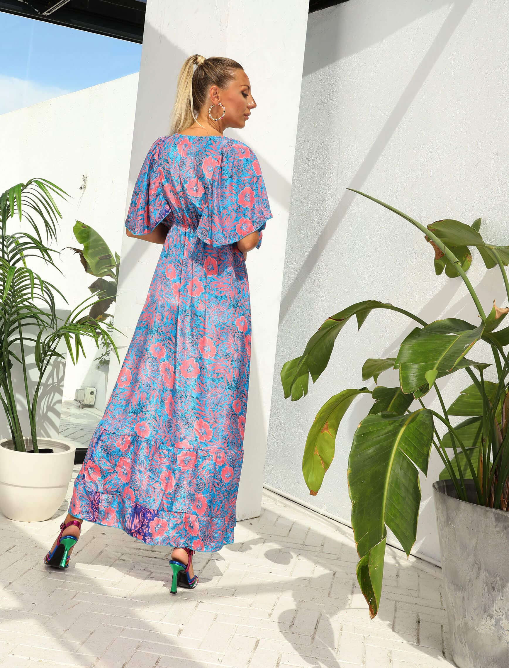 Mavi Yavruağzı Çiçek Desen V Volan Elbise