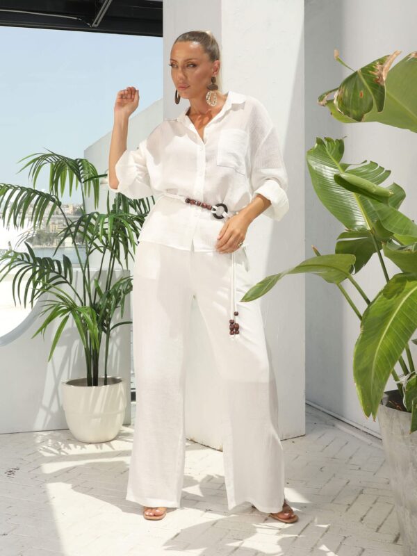Beyaz Bürümcük Kemerli Oversize Gömlek Pantolon Takım