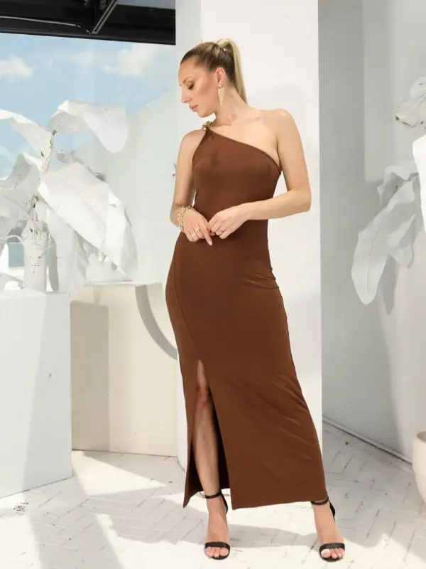 Kahve Gold Zincir Detay Tek Omuz Elbise