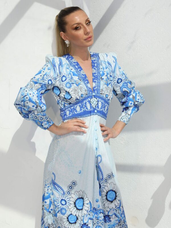 Bebe Mavi Çiçek Desen V Yaka Elbise