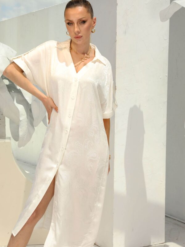 Ekru Şal Desen Jakar Saten Elbise