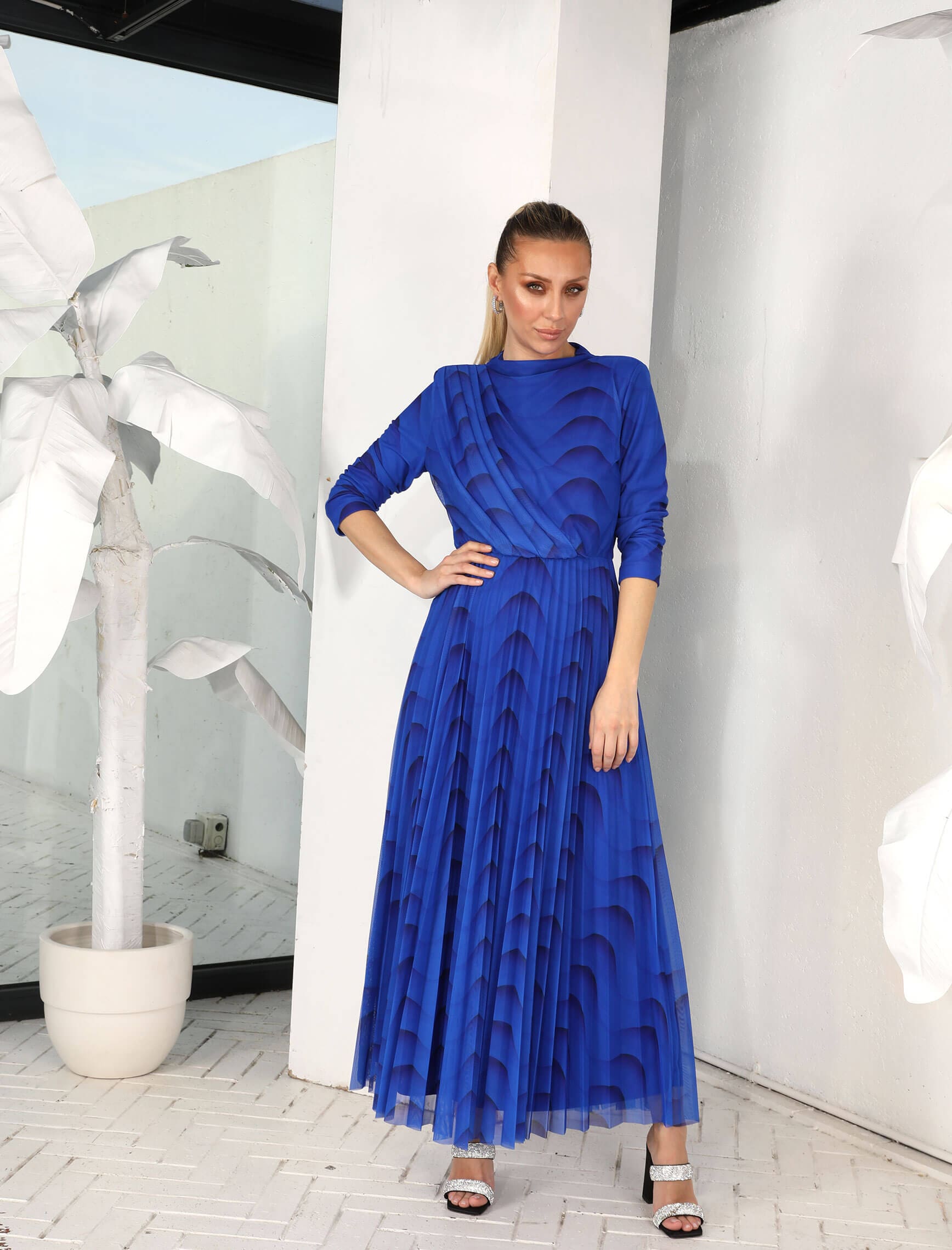 Saksrengi Omuz Drape Şifon Elbise