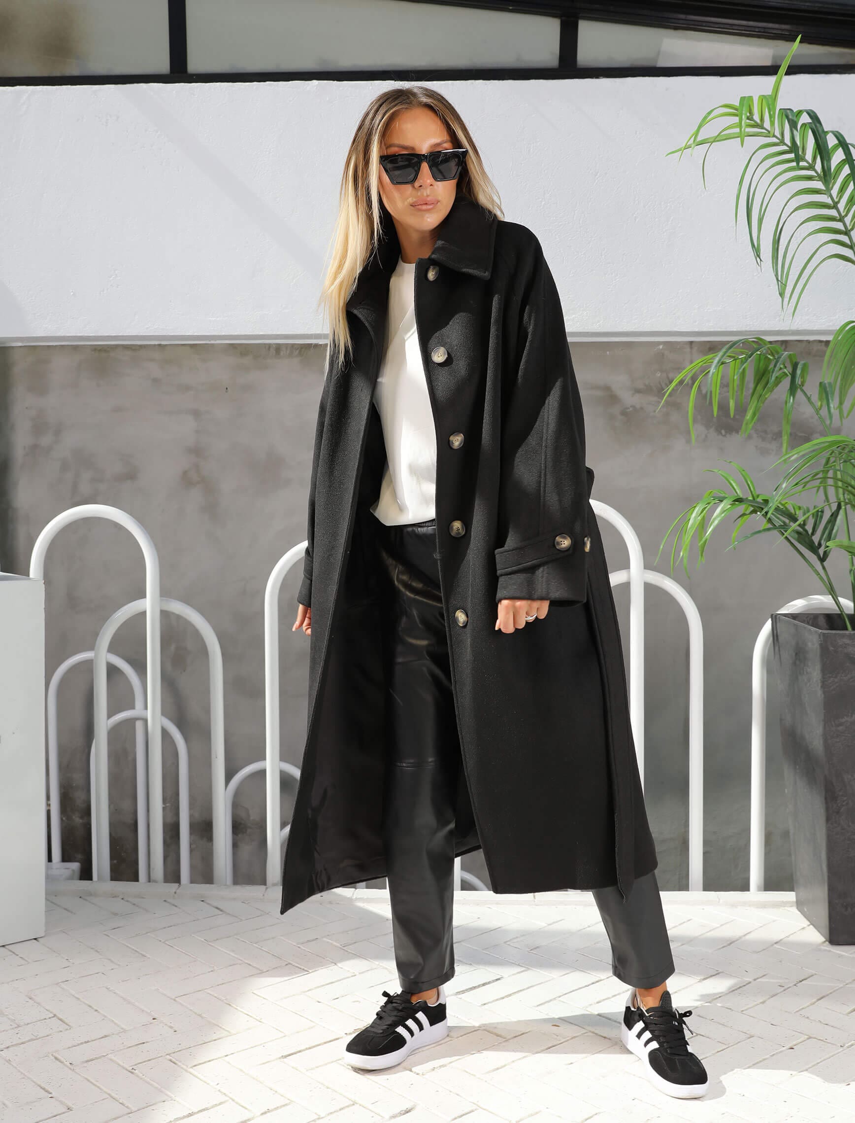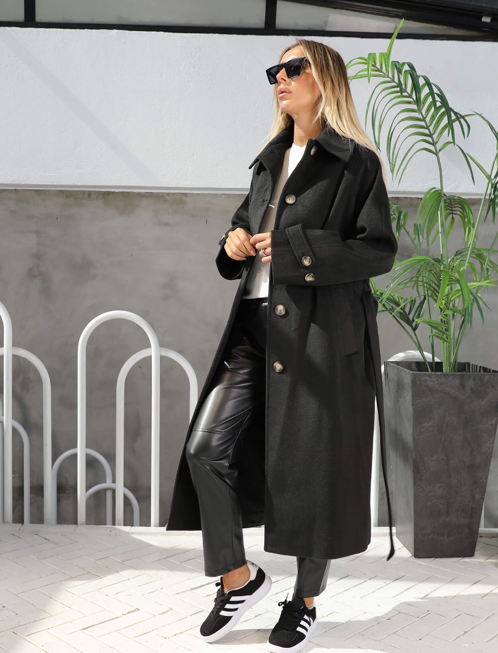 Siyah Belden Bağlama Tüylü Kaşe Kaban