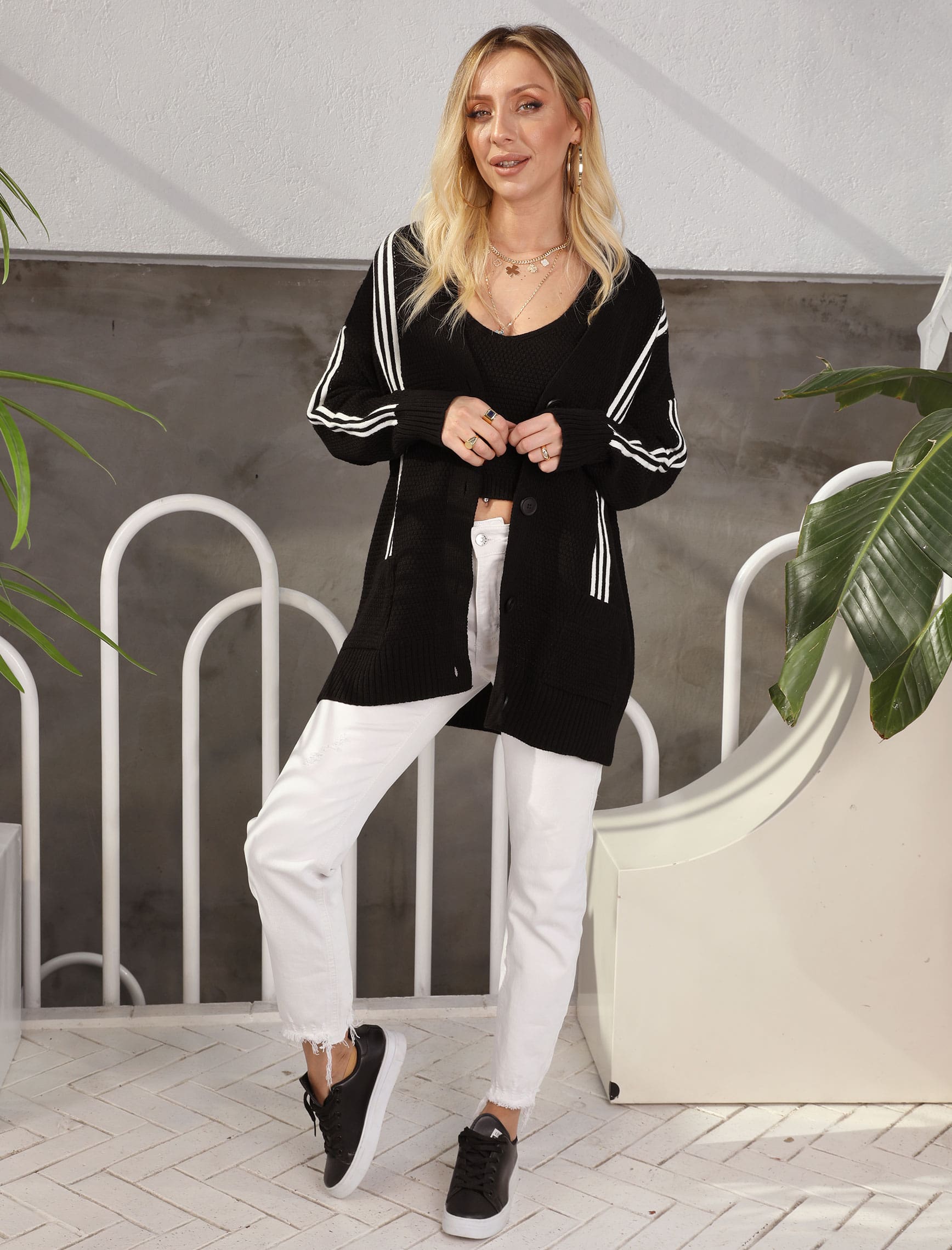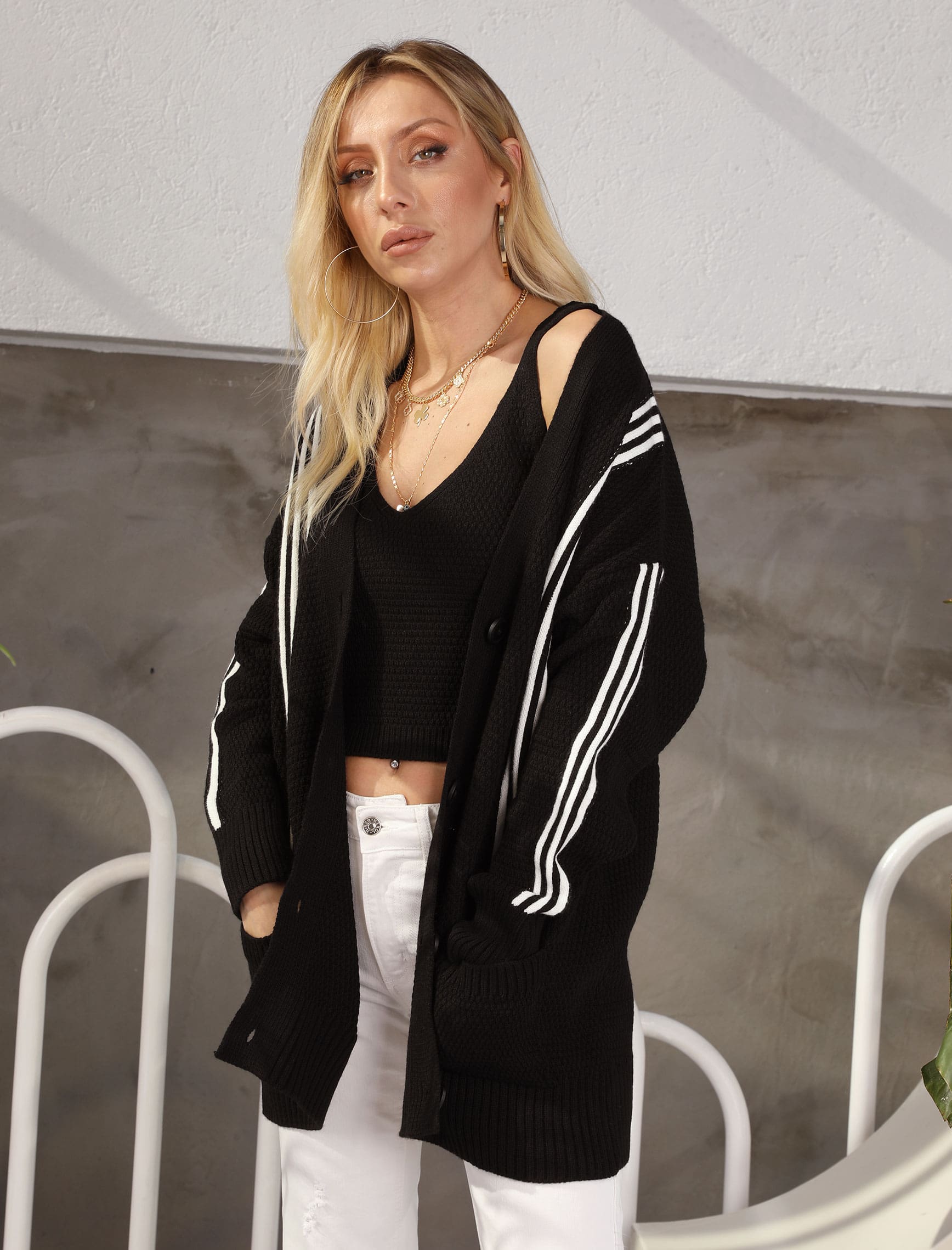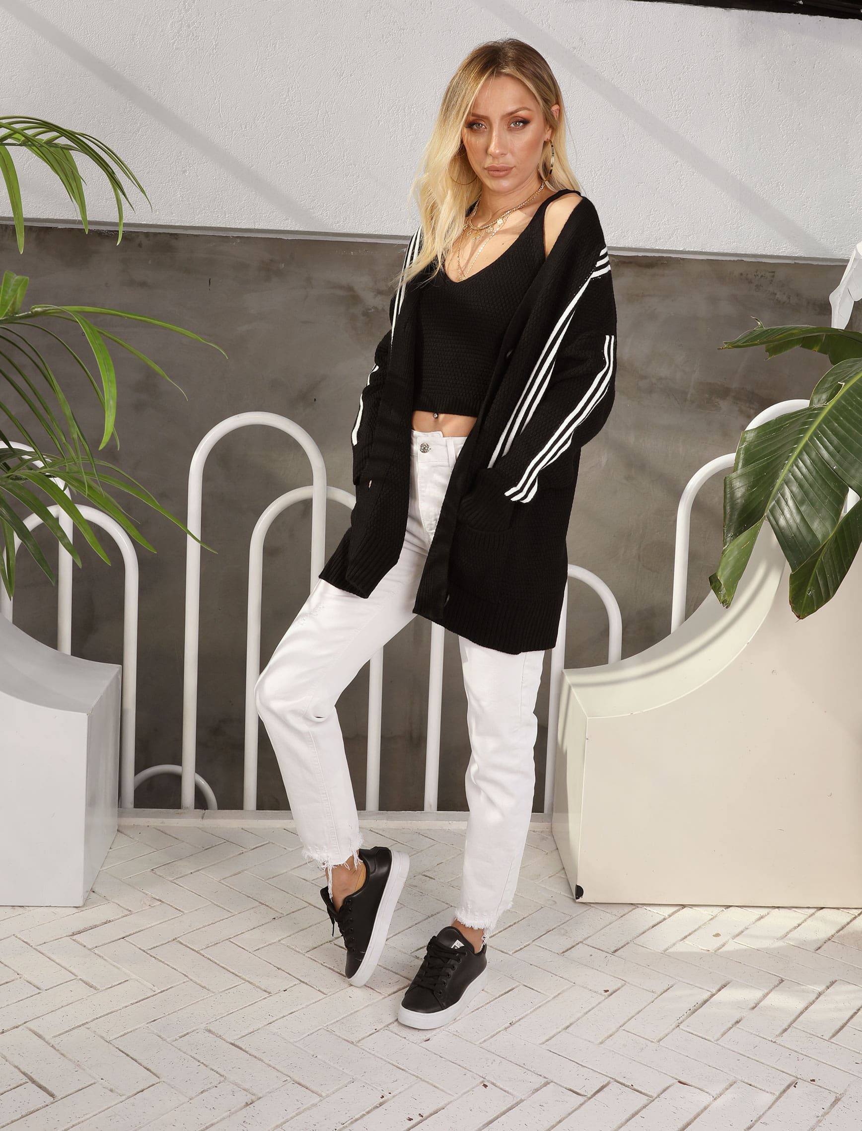 Siyah Beyaz Çizgili Crop Hırkalı Takım