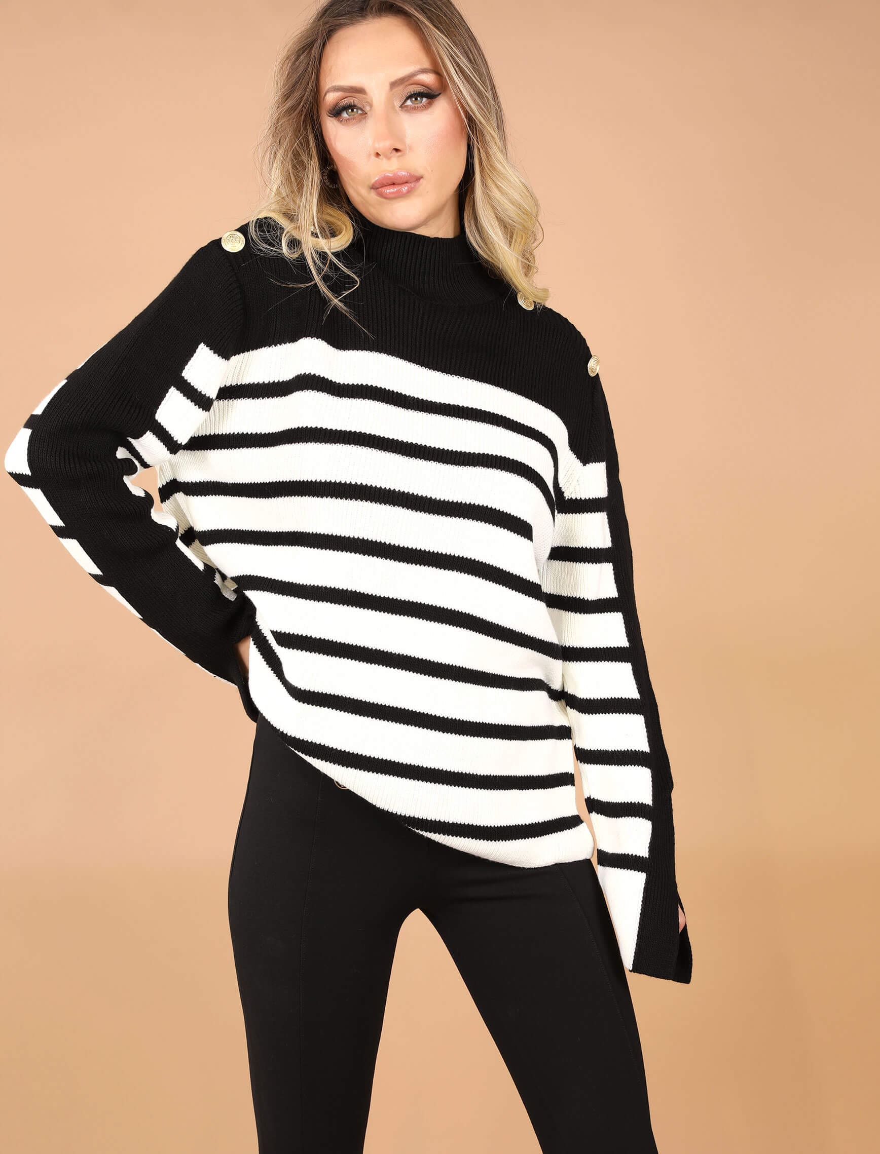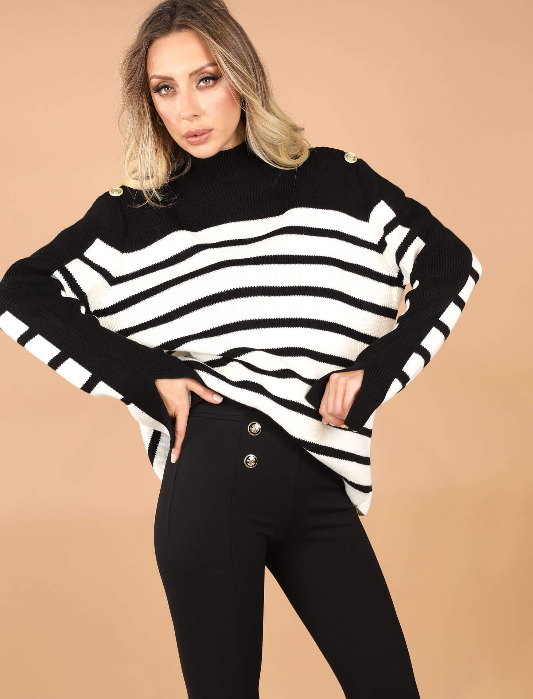Siyah Beyaz Kol Yırtmaç Triko
