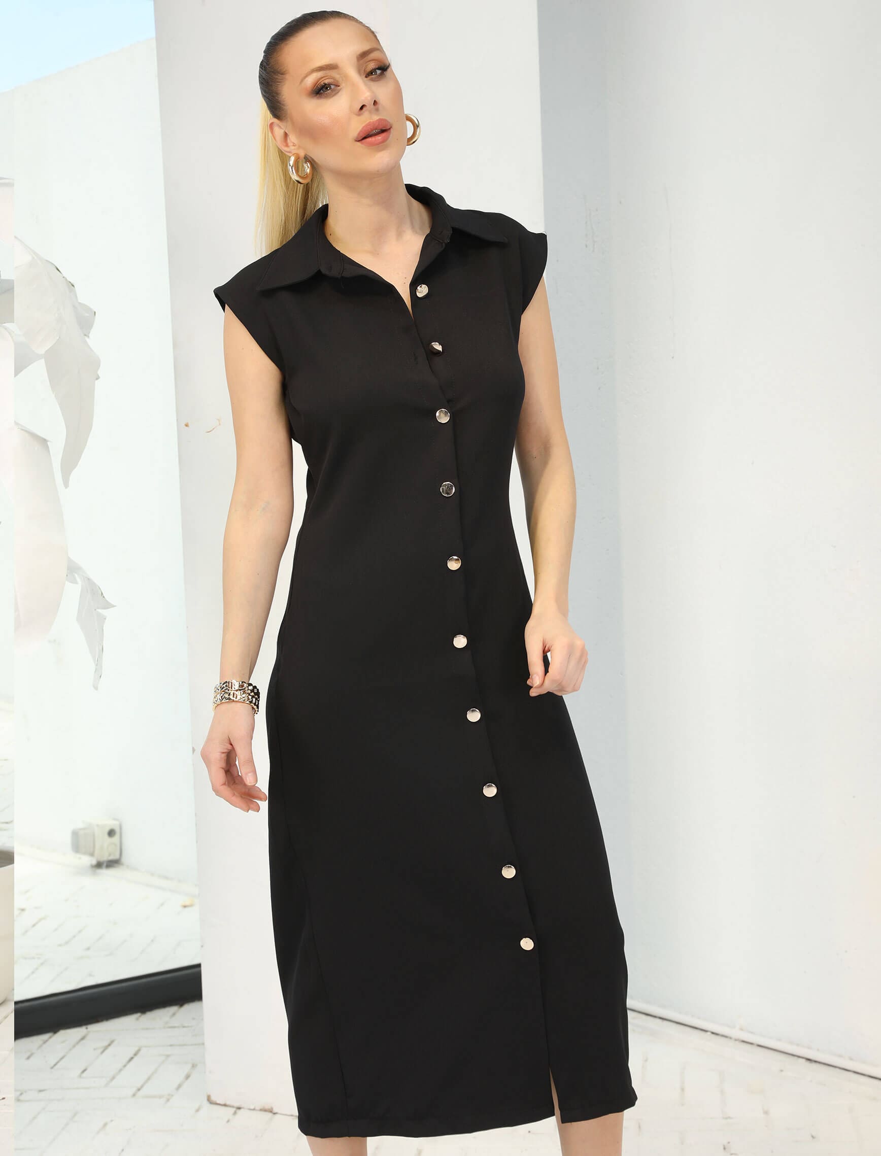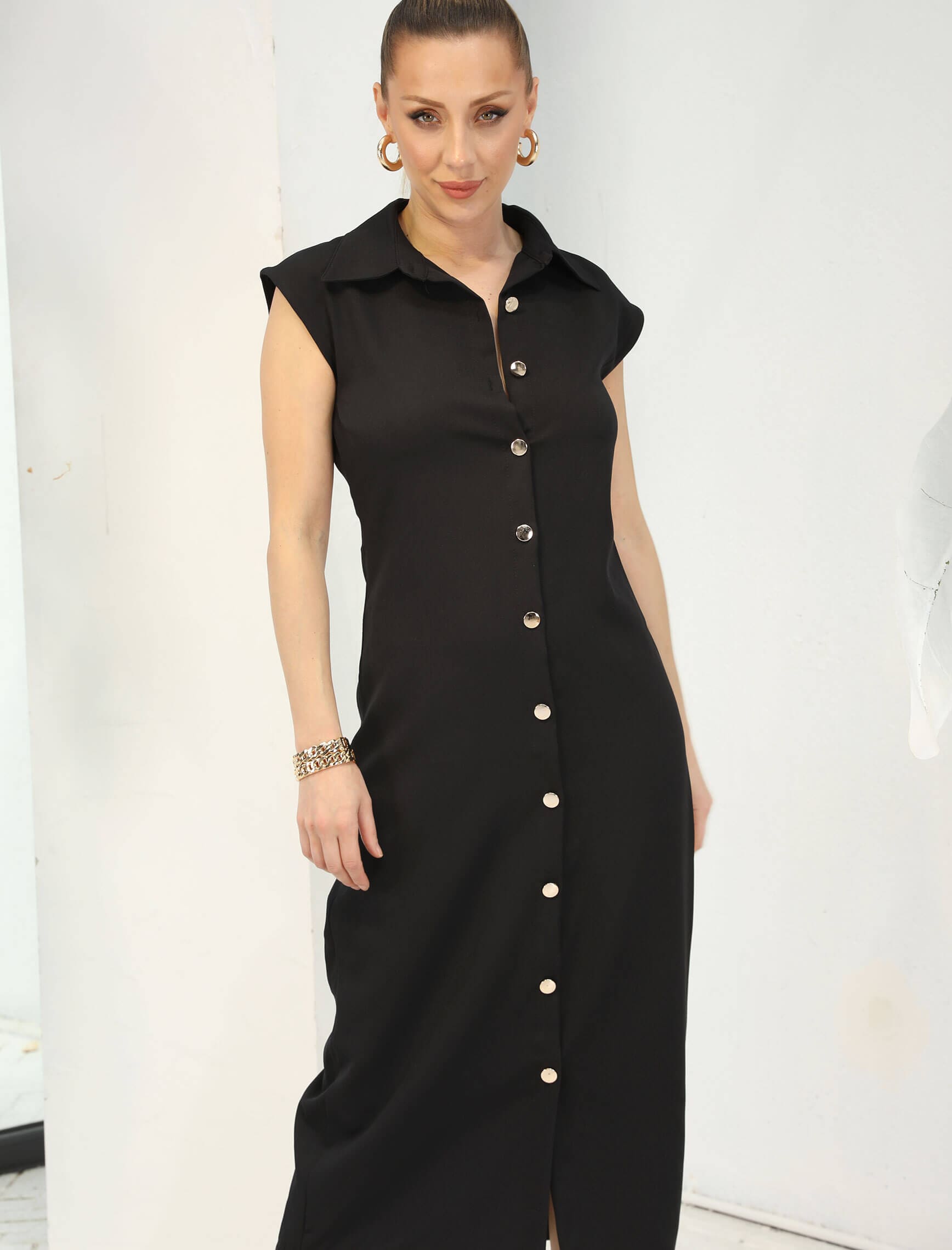 Siyah Gold Düğme Kolsuz Elbise
