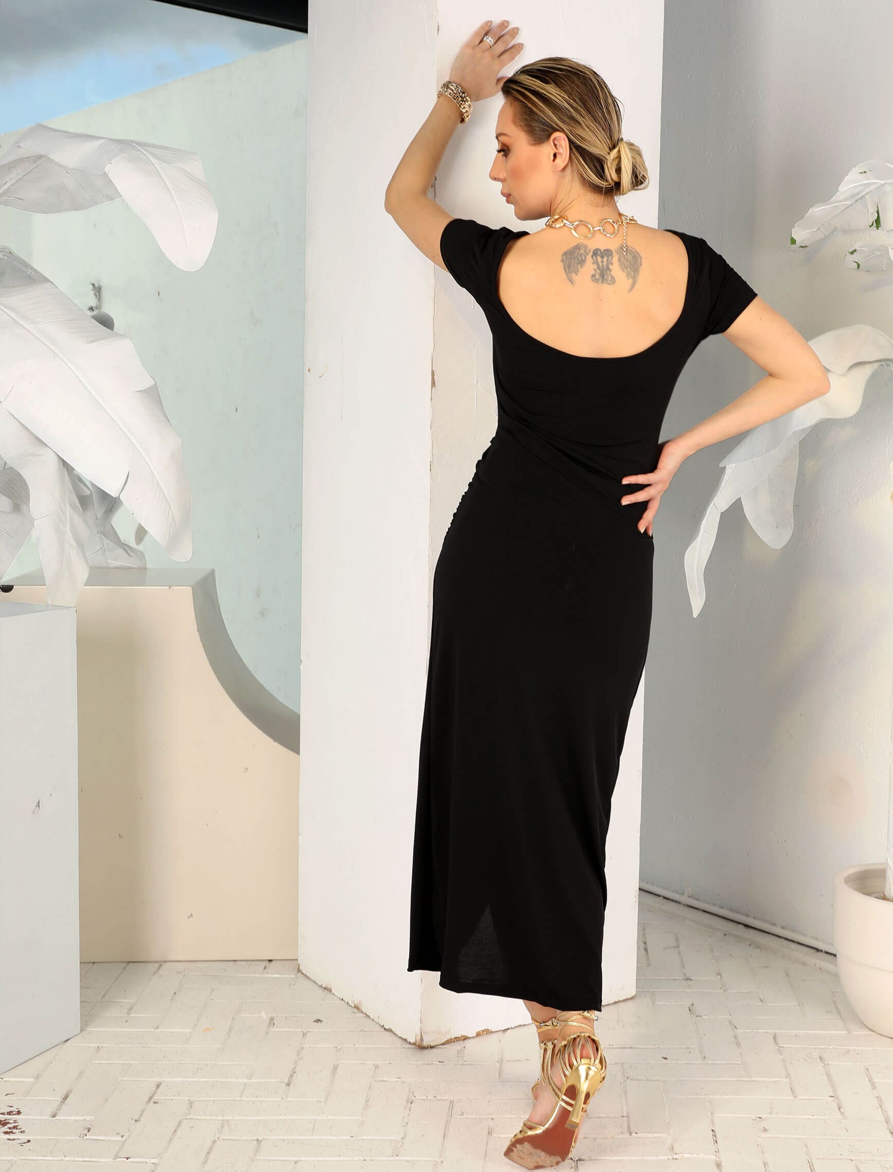 Siyah Gold Toka Kruvaze Yırtmaç Elbise