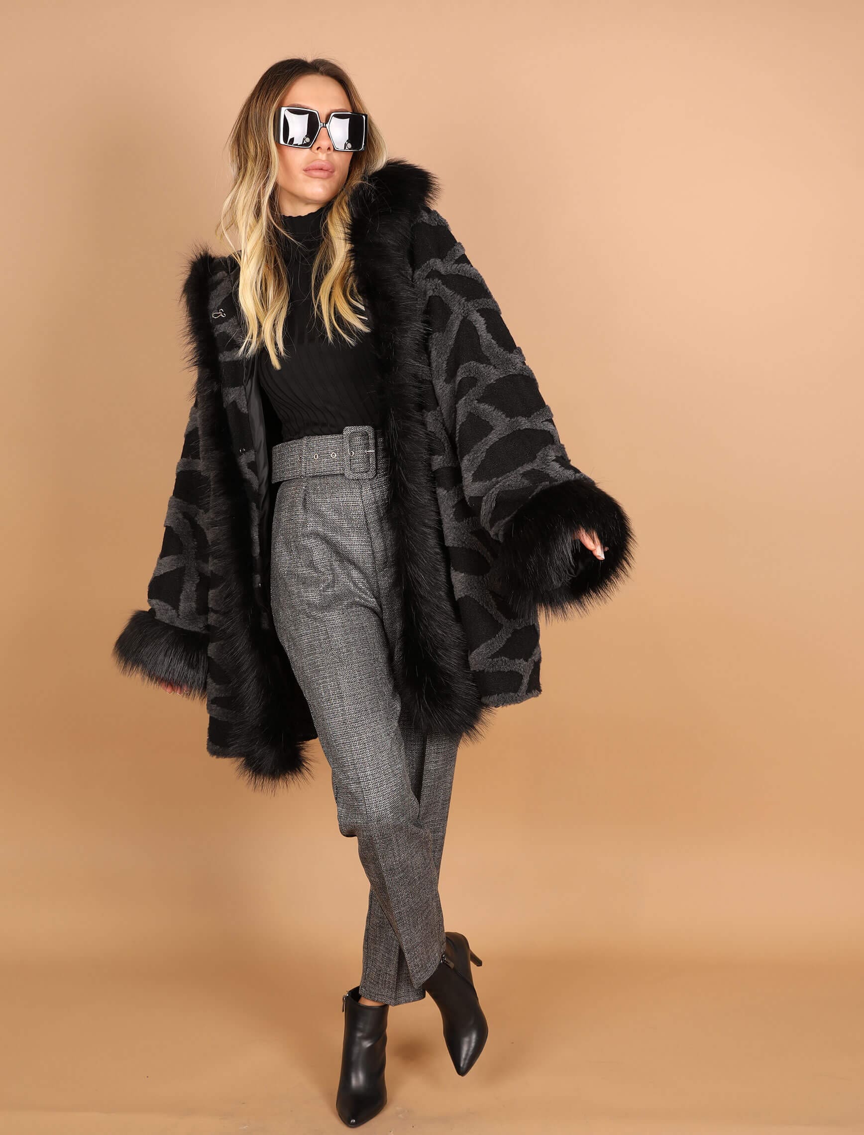 Siyah Gri Çizgi Desen Kürklü Kaban