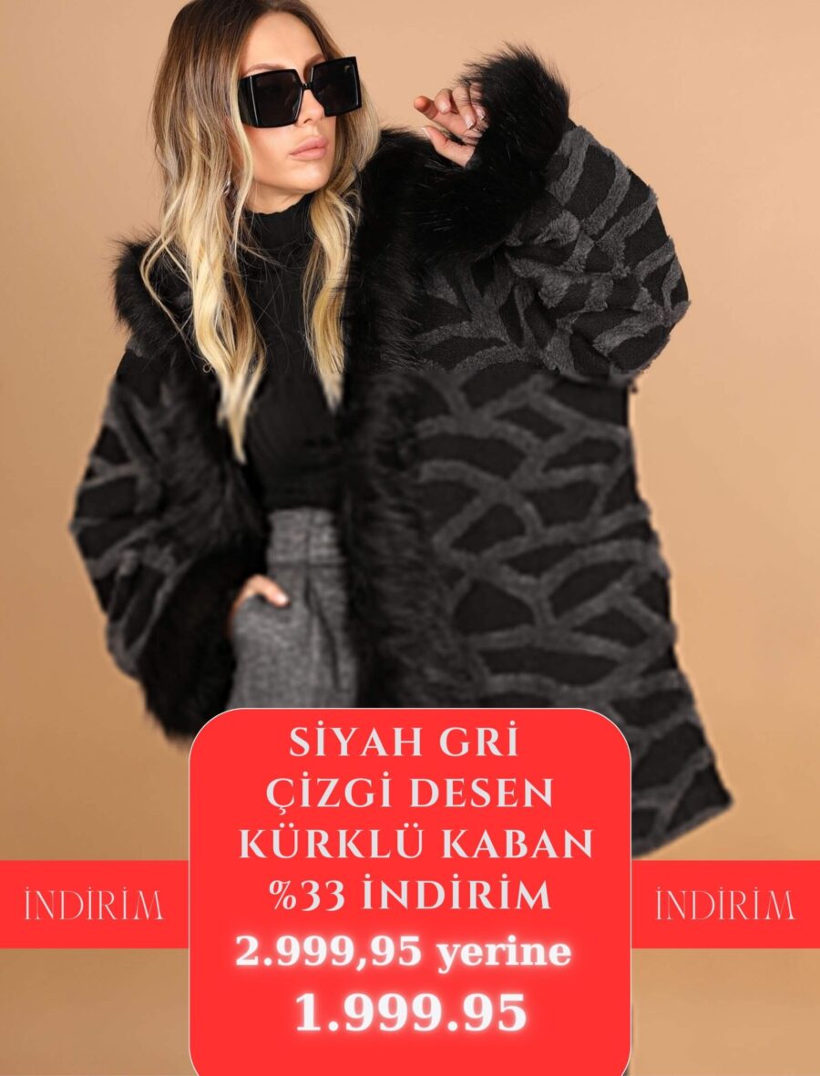 Siyah Gri Çizgi Desen Kürklü Kaban