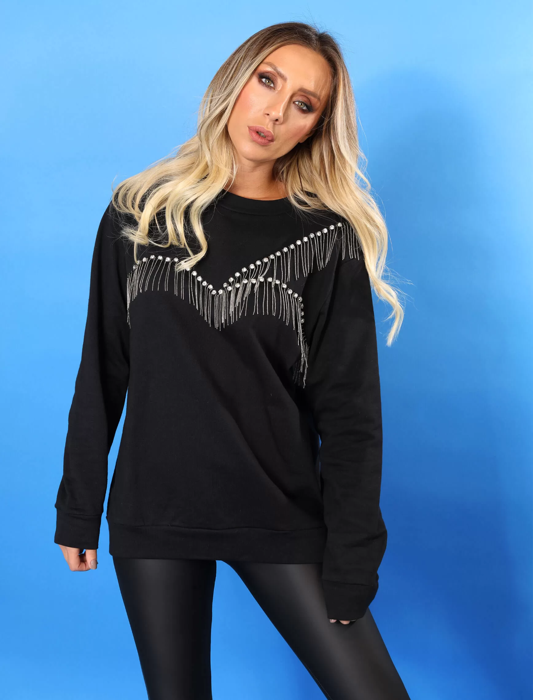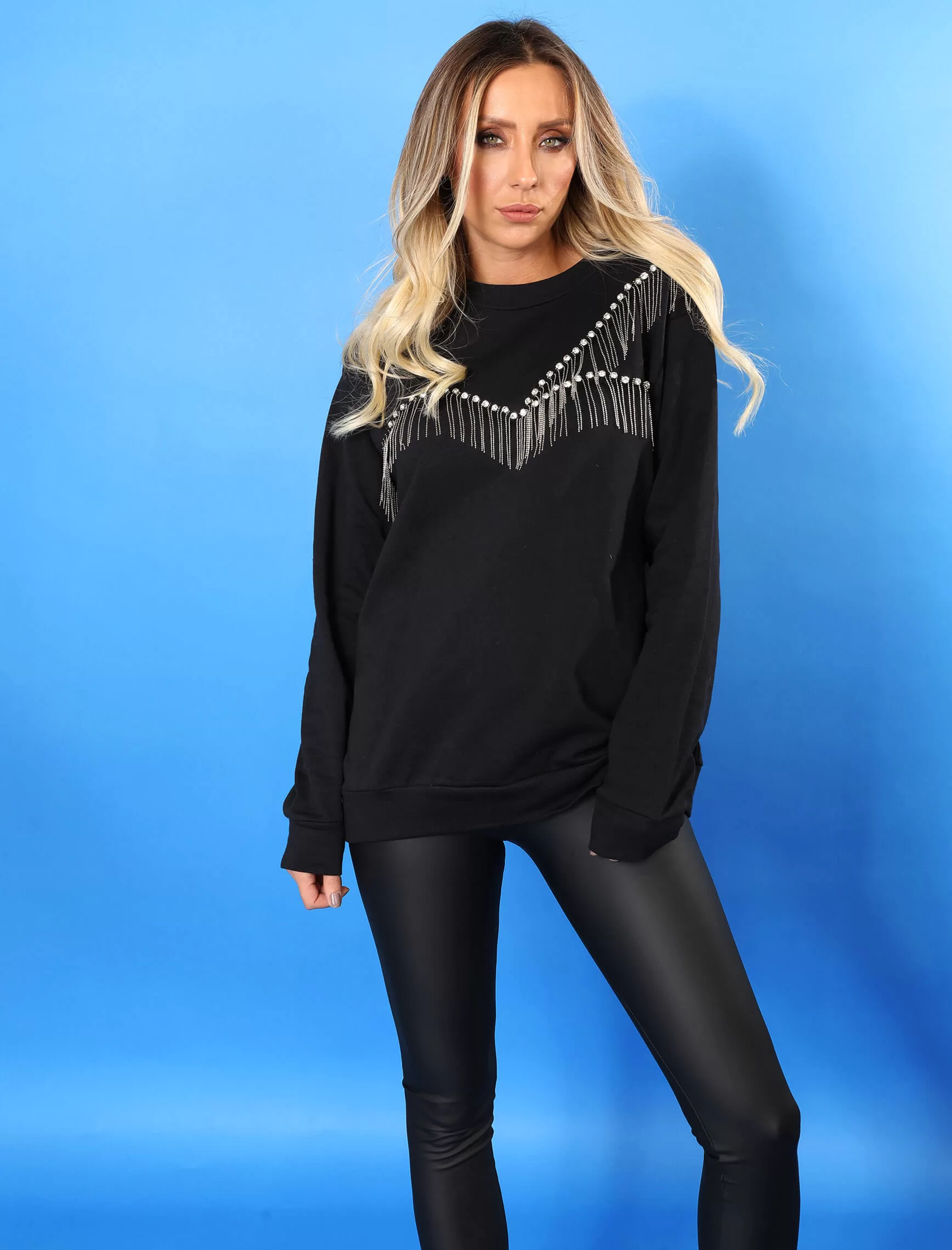 Siyah Önü Taş Zincir Püskül Sweat