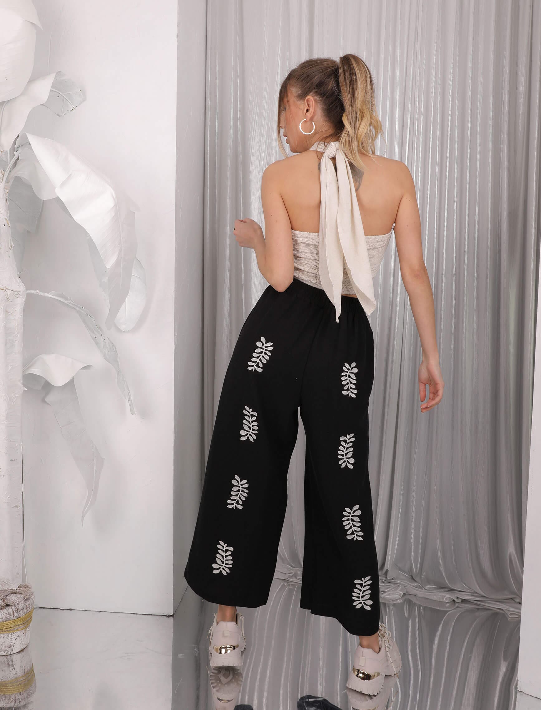 Siyah Yaprak Nakış İşleme Keten Pantolon