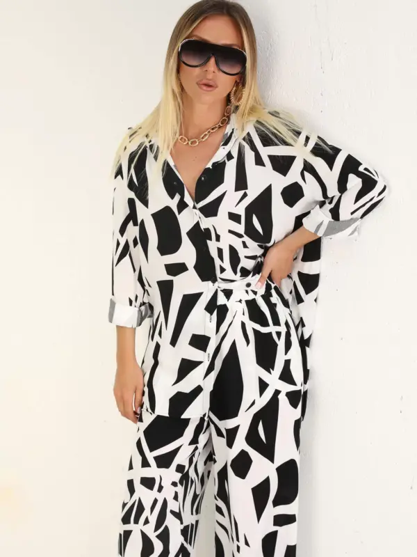Gri Bej Etnik Batik Şort Gömlek Takım
