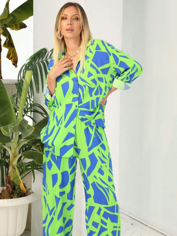 Turkuaz Bej Etnik Batik Şort Gömlek Takım