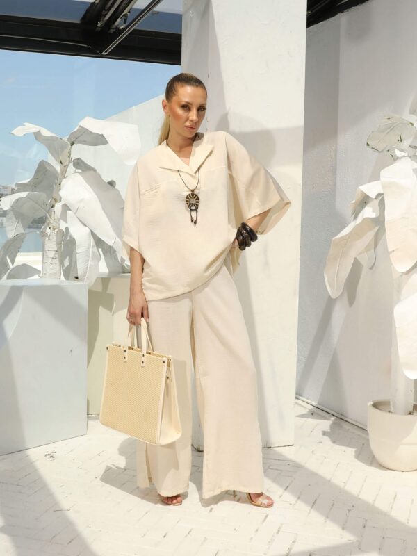 Beyaz Bürümcük Kemerli Oversize Gömlek Pantolon Takım