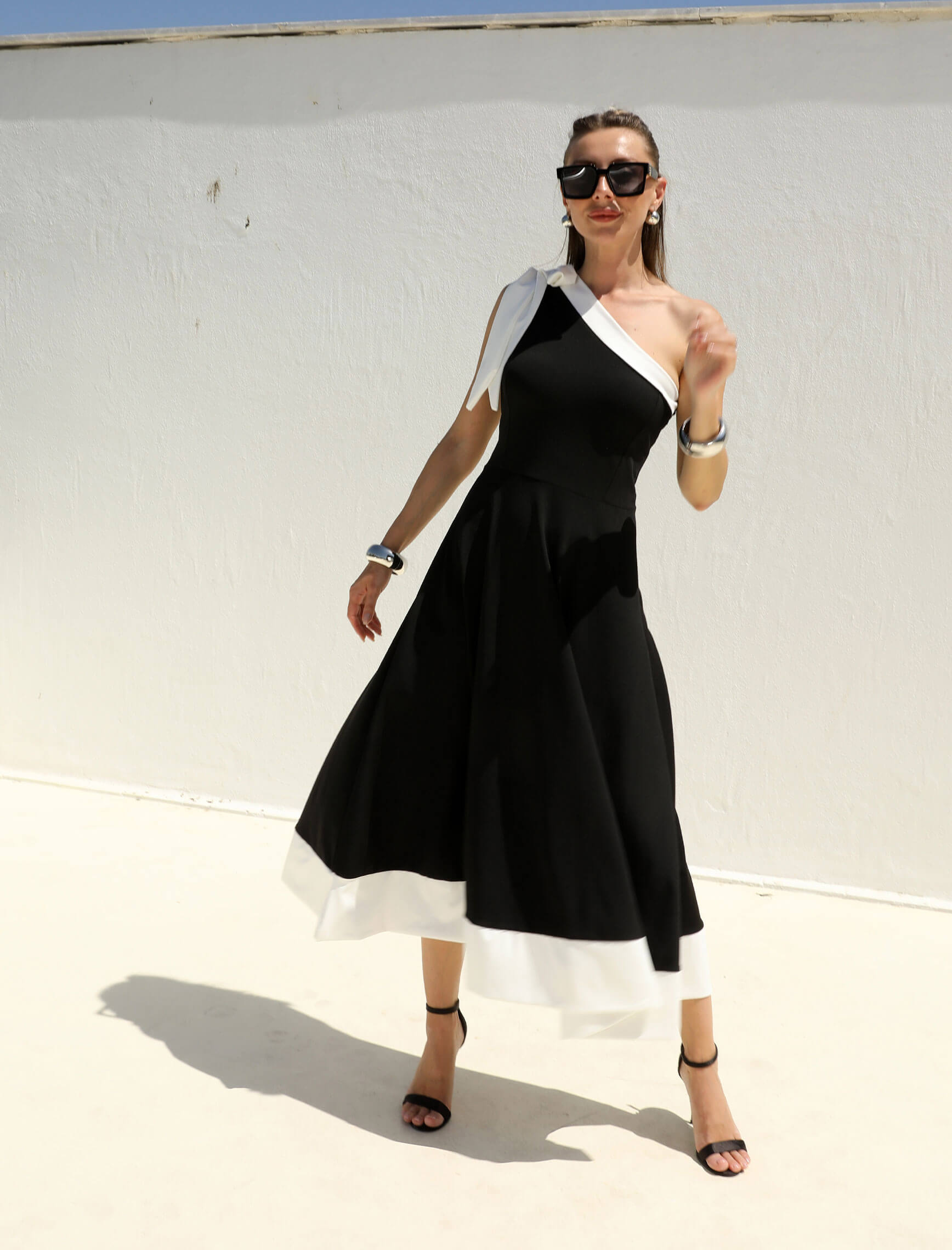 Tek Omuz Fiyonk Siyah Beyaz Elbise